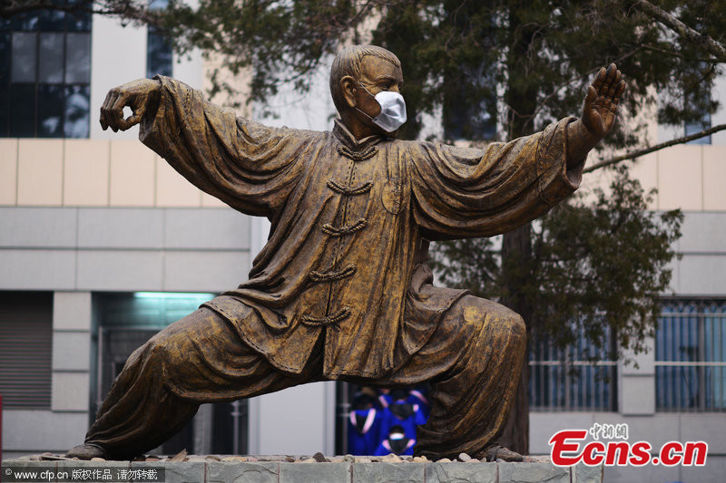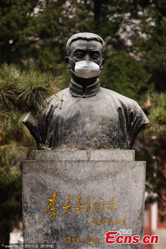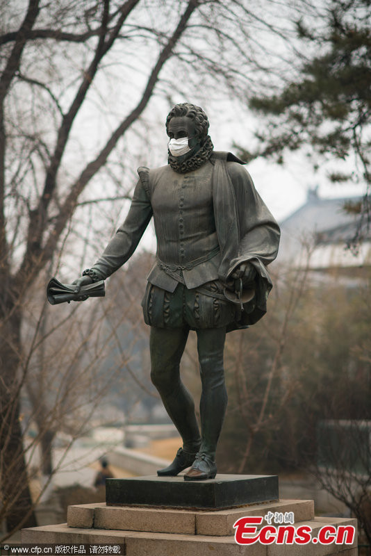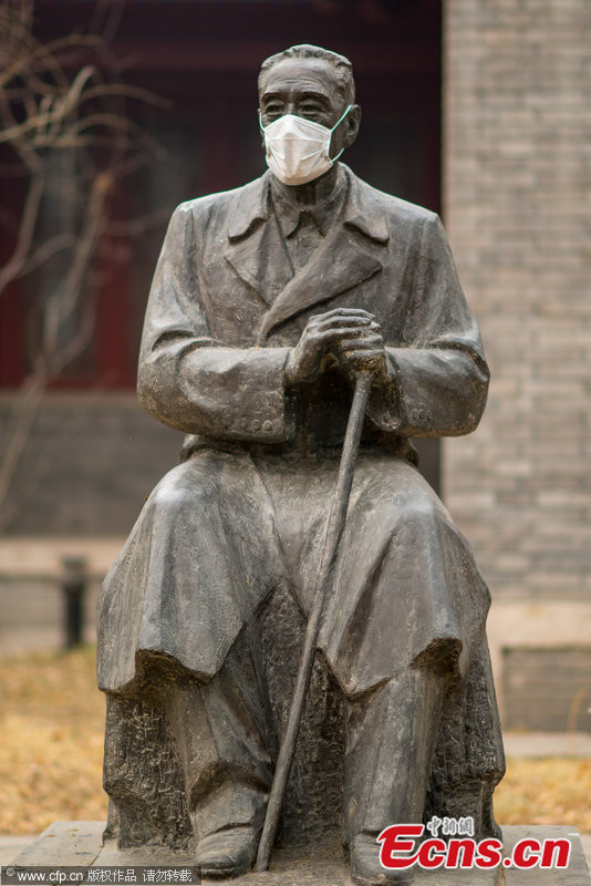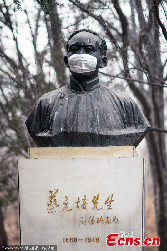 Photo taken on Feb. 22, 2014 shows a statue wears a mask at Peking University in Beijing. The capital city on Monday maintained its orange pollution alert, the second-highest alert level, as severe smog is forecast to linger in the Chinese capital for another three days. [Photo/CFP]