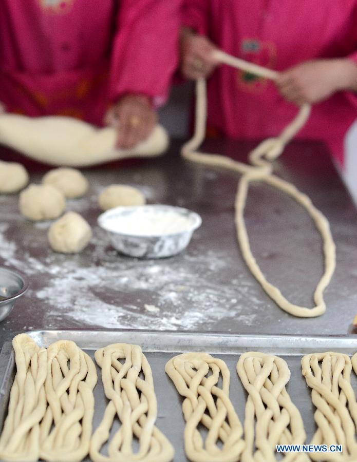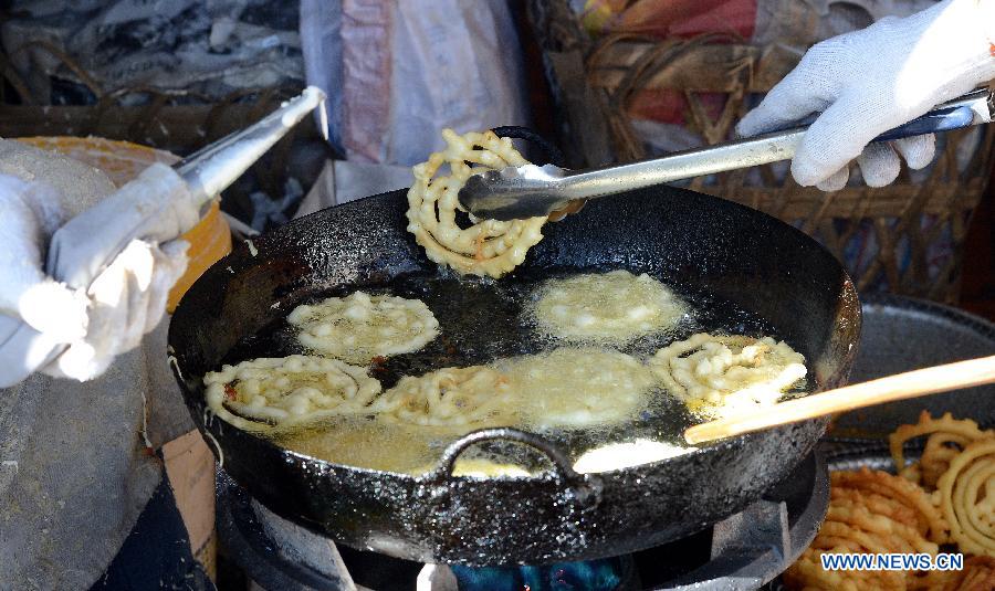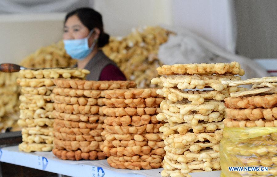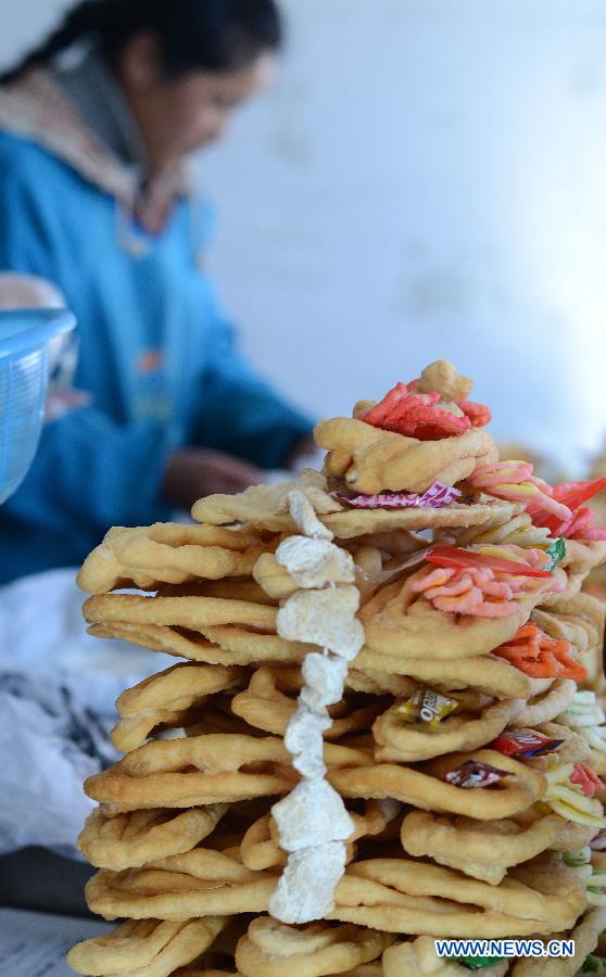 A dealer sells "Kasai," a traditional Tibetan food, to receive the coming Tibetan New Year, or "Losar", in Lhasa, capital of southwest China's Tibet Autonomous Region, Feb 24, 2014. People of the Tibetan ethnic group will embrace the "Wood Horse Losar" on March 2. (Xinhua/Chogo)