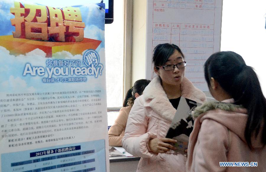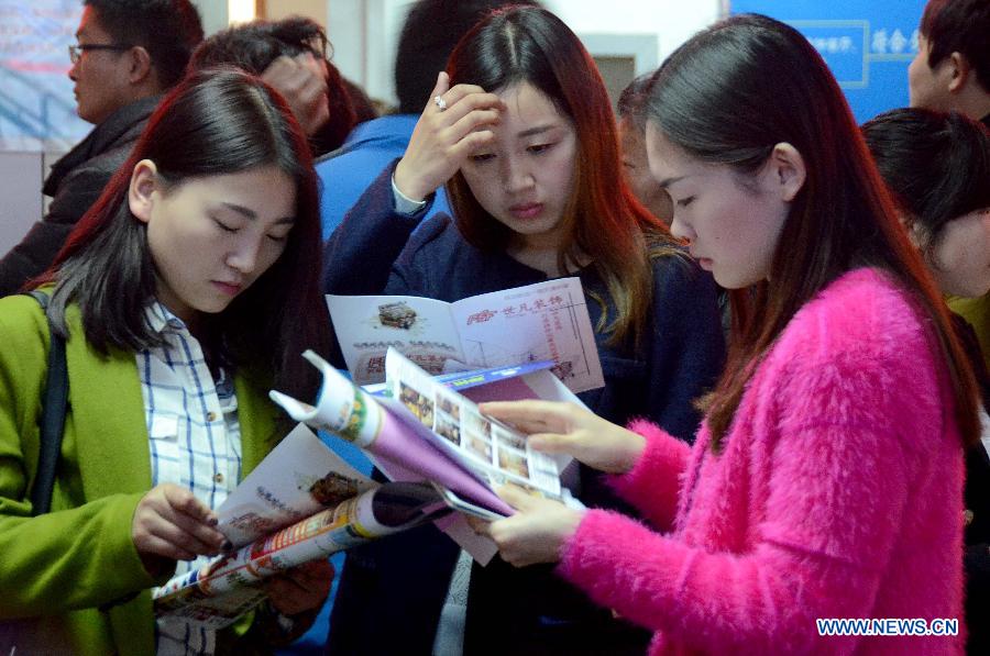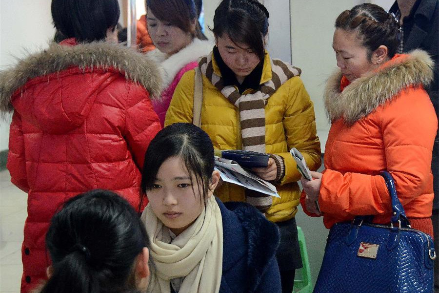 Job seekers receive interview at a job fair specially held for female job hunters in Zhengzhou, capital of central China's Henan province, Feb 25, 2014. A job fair was held specially for female job hunters here, providing more than 8,000 vacancies. (Xinhua/Li An)