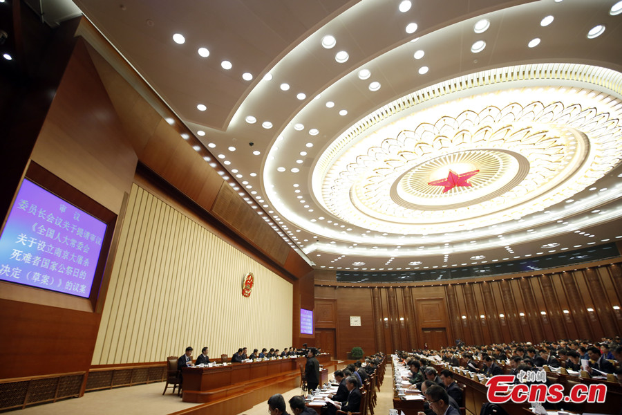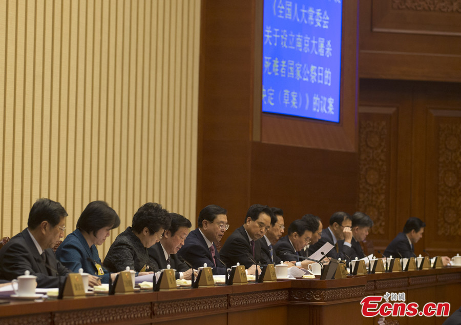 Chinese lawmakers are mulling making December 13 a national memorial day to commemorate those killed by Japanese aggressors during the Nanjing Massacre in the 1930s.The draft decision is discussed at the bi-monthly session of the Standing Committee of the National People's Congress (NPC) which runs from Tuesday through Thursday. [Photo: China News Service / Sheng Jiapeng]