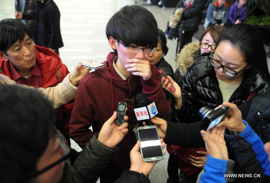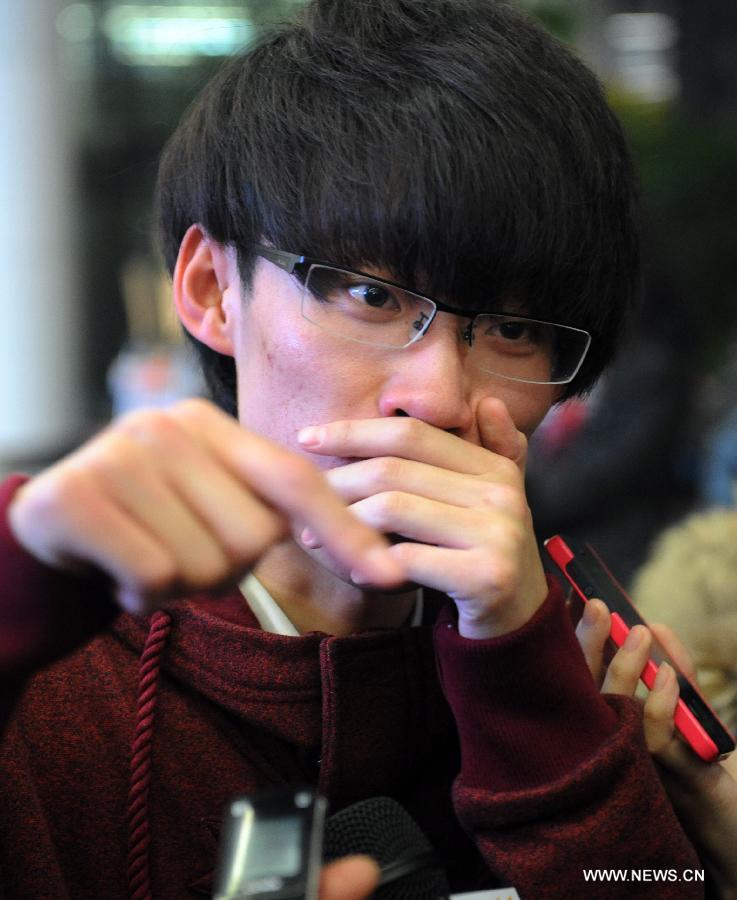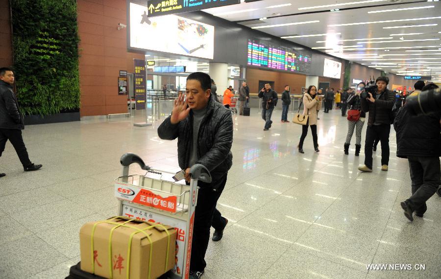 A passenger tells the story of the incident at Shenyang Taoxian International Airport in Shenyang City, capital of northeast China's Liaoning Province, Feb. 25, 2014. A flight bound for Shenyang City of northeast China's Liaoning Province has made a successful landing after a faulty instrument forced it to delay descent. Flight BK2870, operated by Okay Airways Company Ltd. headquartered in Beijing, landed successfully at Shenyang Taoxian International Airport at 8:24 p.m., more than two and half hours later than the scheduled time, a spokesman with the airline told Xinhua. No casualties were reported. (Xinhua/Yang Qing)