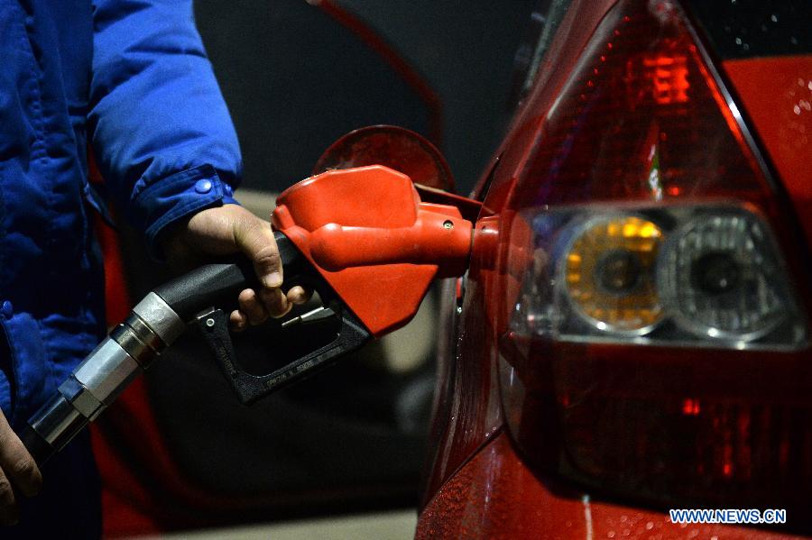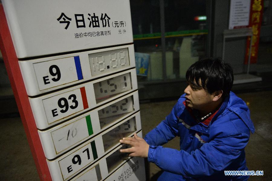 A worker alters price tags at a gas station in Baoding, north China's Hebei Province, Feb. 27, 2014. China on Thursday raised the per-tonne retail price of gasoline by 205 yuan (33.61 U.S. dollars) and diesel by 200 yuan. (Xinhua/Zhu Xudong)