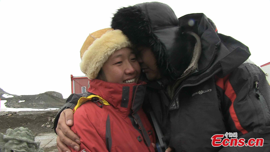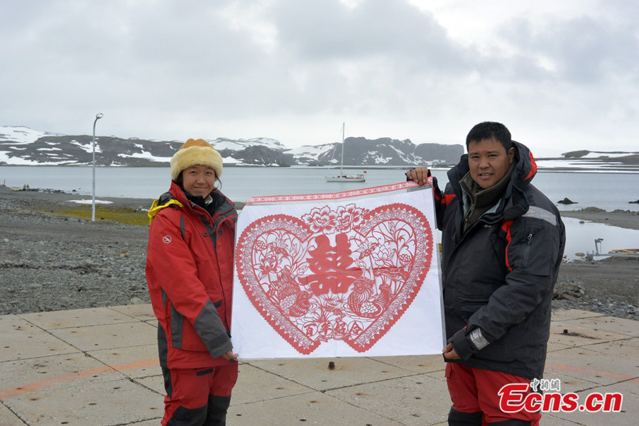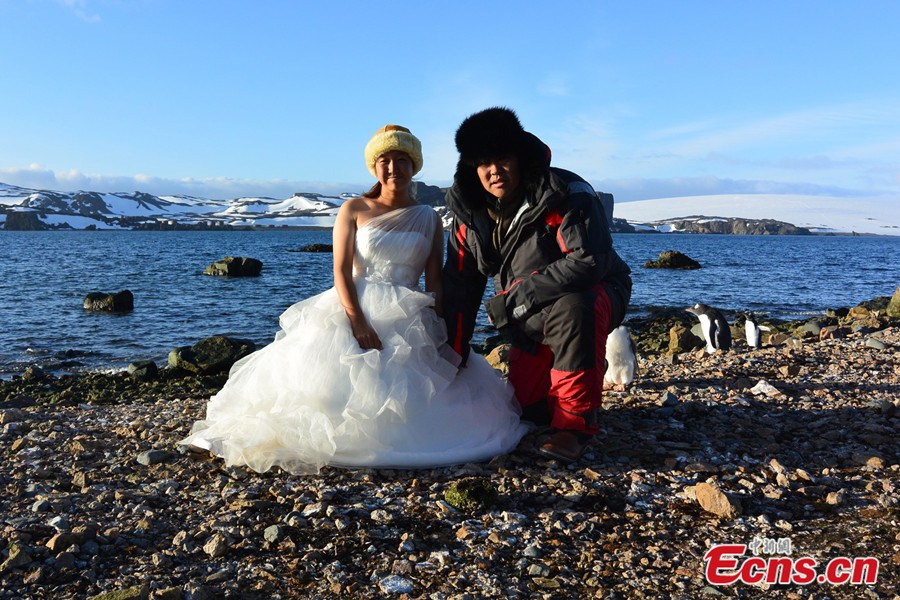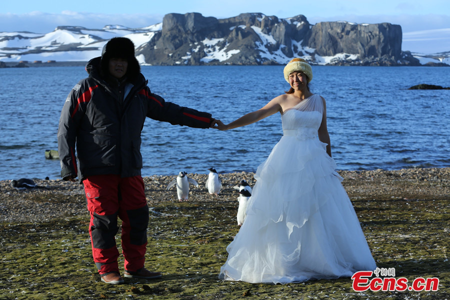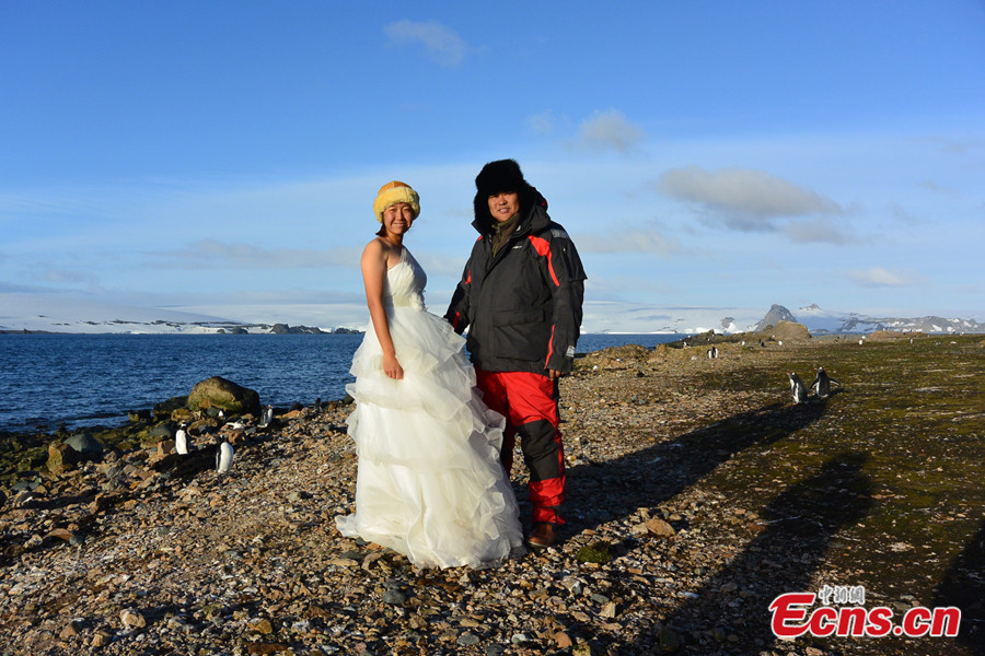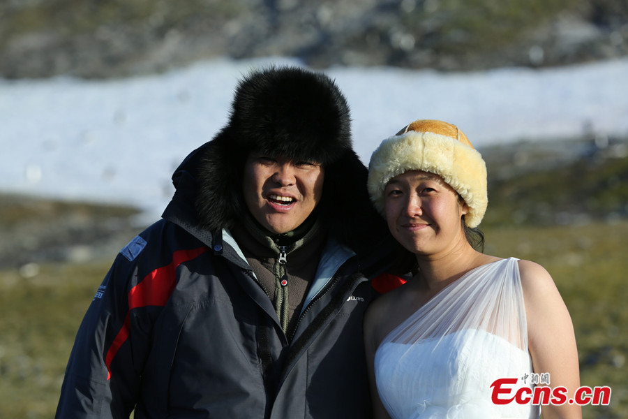 Beijing young couple, Zhang Xinyu and Liang Hong, holds their wedding in Antarctica on Feb. 25, 2014. Zhang and Liang arrived at the Great Wall Station, Chinese research station in Antarctica, on Feb. 20, 2014 after 231-day journey. [Photo: China News Service / Xin Yu]