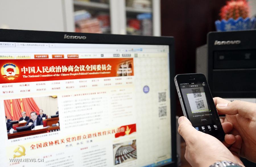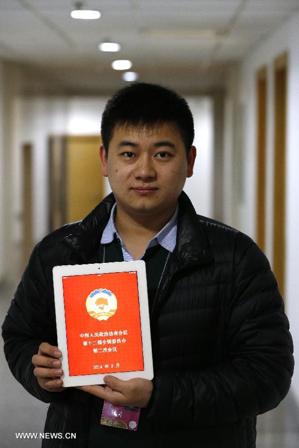 A staff member working for the second session of the 12th National Committee of the Chinese People's Political Consultative Conference (CPPCC), demonstrates the downloading of an app specially developed for the CPPCC session, in Beijing, capital of China, March 1, 2014. Users of the app can receive the latest news and other information of the session, which will open on March 3. (Xinhua/Shen Bohan)