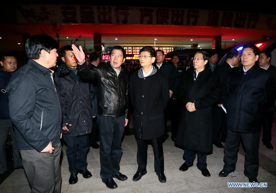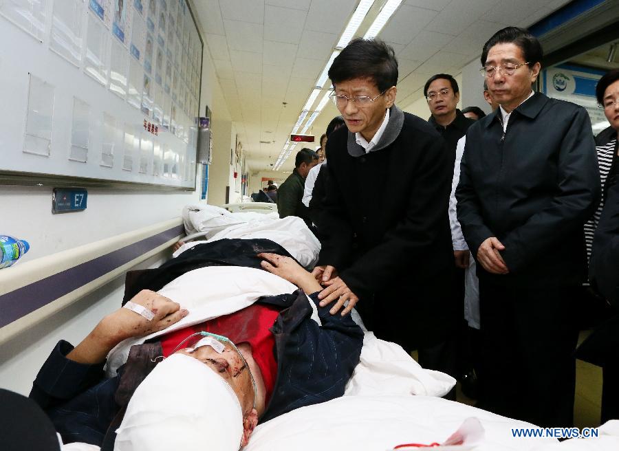Meng Jianzhu (C), head of the Central Commission for Political and Legal Affairs of the Communist Party of China, inspects the crime scene at the Kunming Railway Station in Kunming, capital of southwest China's Yunnan Province, March 2, 2014. At least 29 innocent people were killed and more than 130 others injured during a terrorist attack at the railway station Saturday night. (Xinhua/Hao Fan)