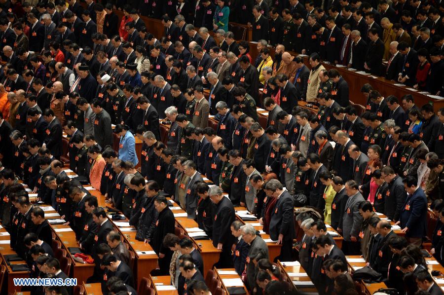 Members of the 12th National Committee of the Chinese People's Political Consultative Conference (CPPCC) pay silent tribute to the victims of the Saturday terrorist attack in southwestern city of Kunming, at the opening of the second session of the 12th National Committee of the CPPCC in Beijing, capital of China, March 3, 2014. The second session of the 12th National Committee of the CPPCC, the national advisory body, opened in Beijing on March 3. (Xinhua/Ding Lin)