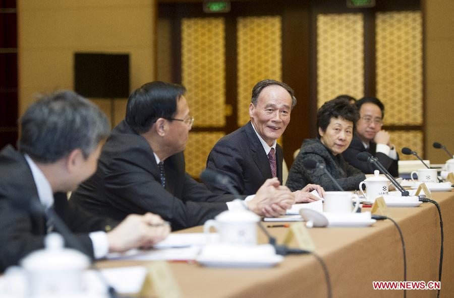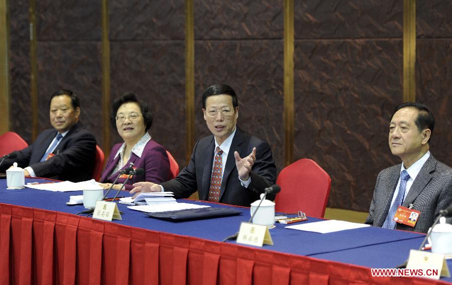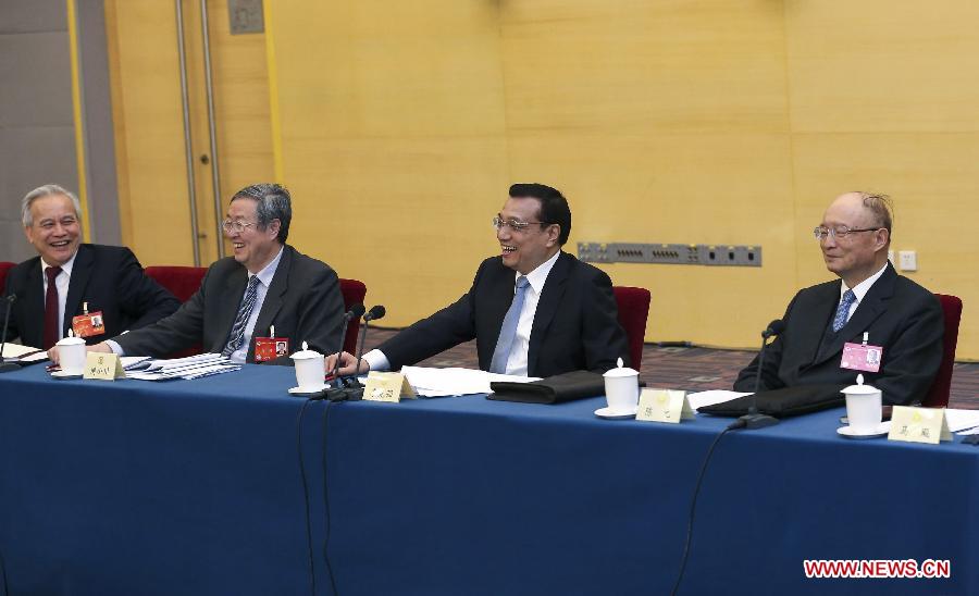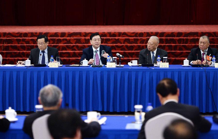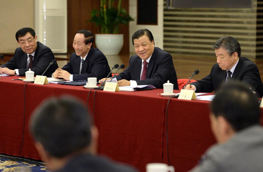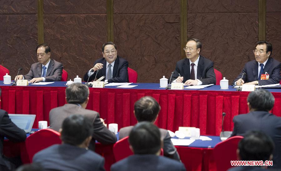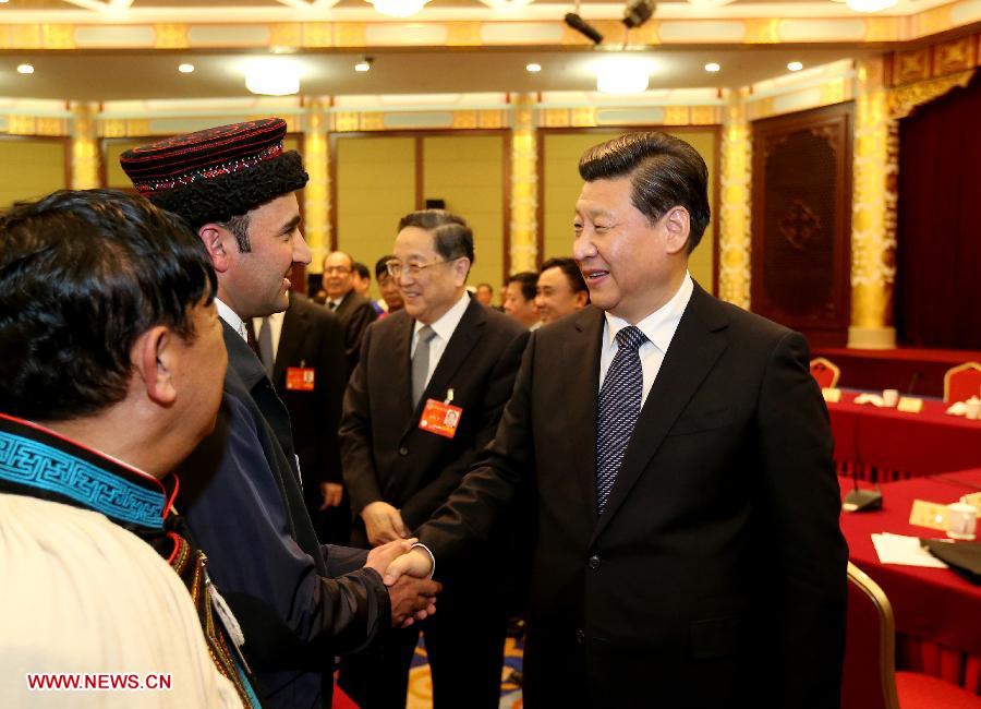 Chinese President Xi Jinping (R), also general secretary of the Communist Party of China (CPC) Central Committee and chairman of the Central Military Commission, visits members of the 12th National Committee of the Chinese People's Political Consultative Conference (CPPCC) from ethnic minority groups and joins their panel discussion in Beijing, capital of China, March 4, 2014. Yu Zhengsheng, chairman of the National Committee of the CPPCC and a member of the Standing Committee of the Political Bureau of the CPC Central Committee, also attended the event. (Xinhua/Ding Lin)