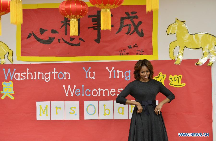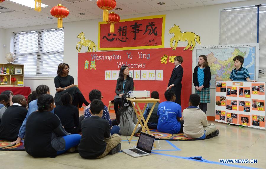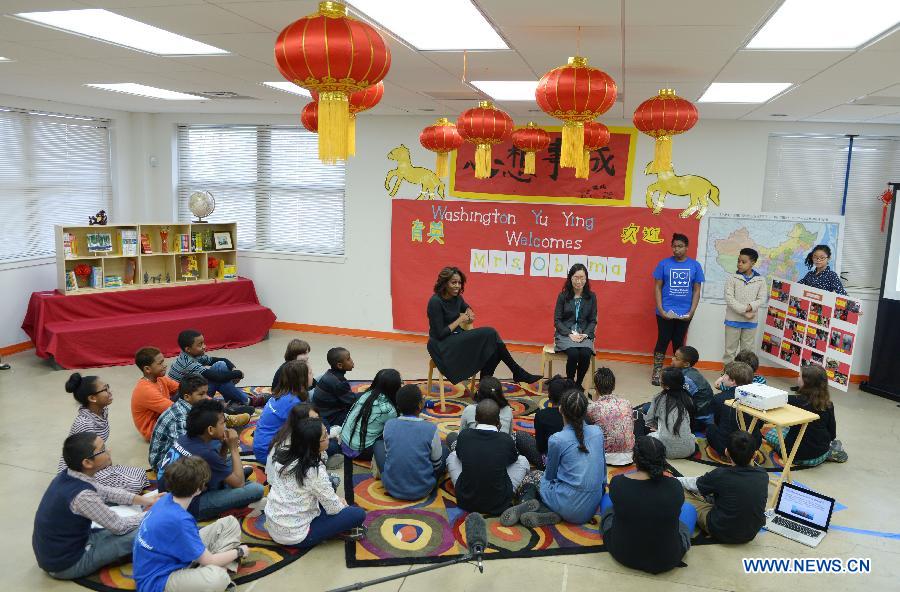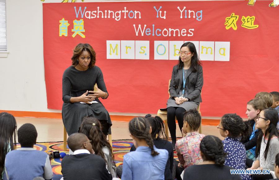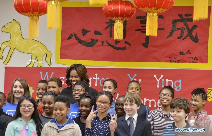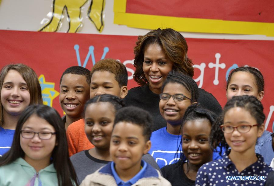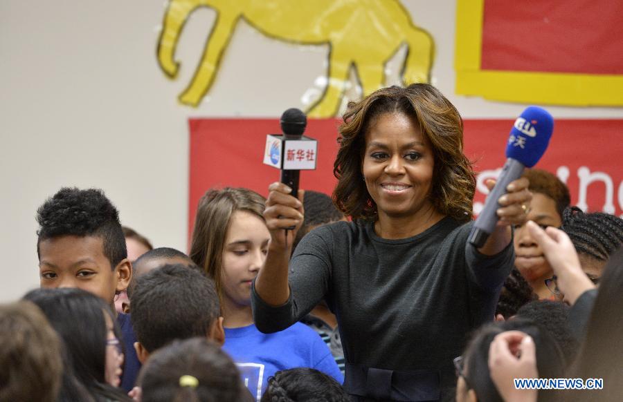 US First Lady Michelle Obama poses for photos with students at Yu Ying Public Charter School, a chinese-immersion, International Baccalaureate, elementary school, before traveling to China, in Washington D.C., the United States, on March 4, 2014. The First Lady will visit China later in March. (Xinhua/Yin Bogu)