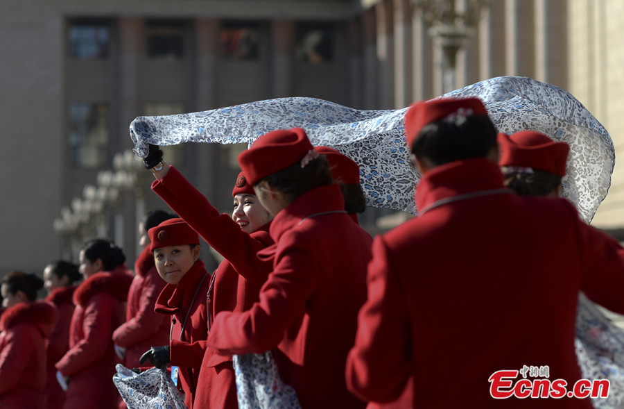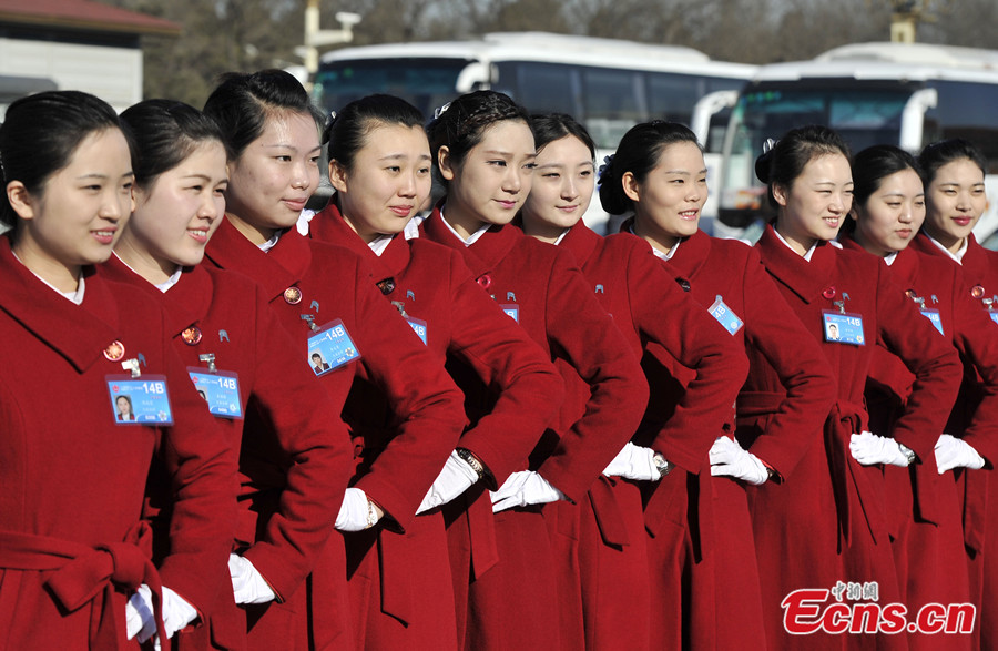 Service staff members pose for photos at the Tian'anmen Square in Beijing on Mar. 5, 2014, which day also saw the opening meeting of the second session of China's 12th National People's Congress (NPC). [Photo: China News Service / Chen Chao]