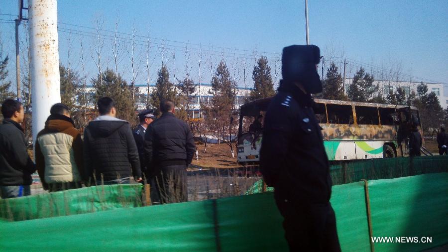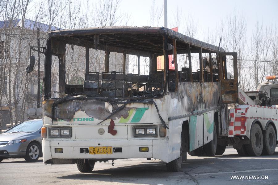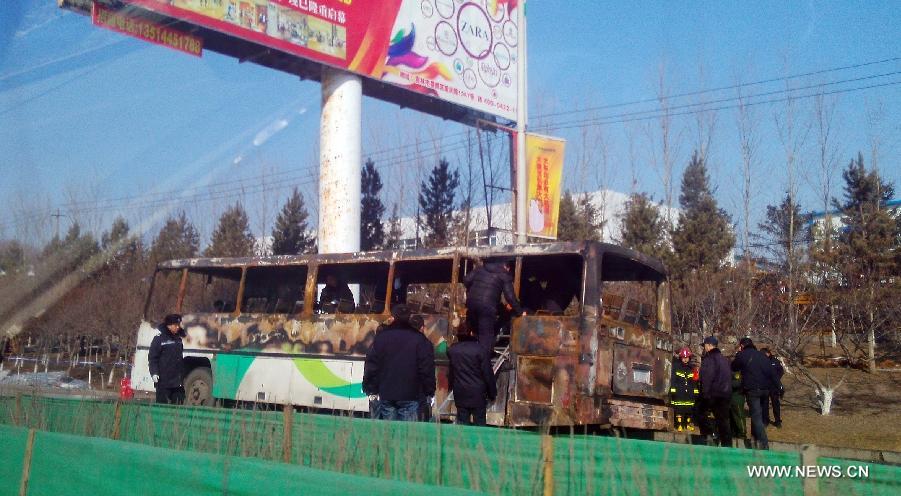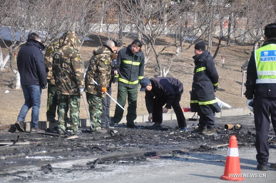 Rescuers investigate the site of a bus fire in Jilin, northeast China's Jilin province, March 5, 2014. Ten people were killed and another 17 injured in a bus fire Wednesday morning when the bus was traveling along a street in Jilin. Forty-three people were on board when the fire broke out. (Xinhua)