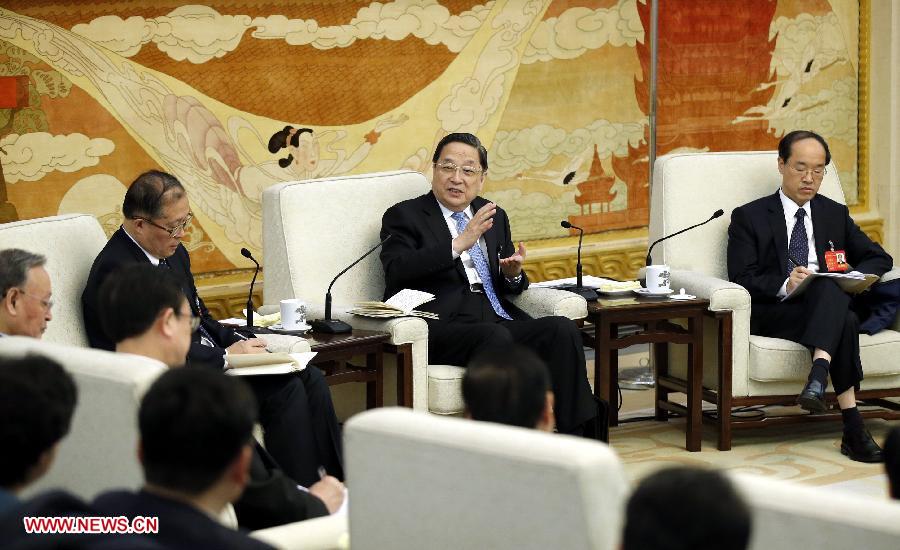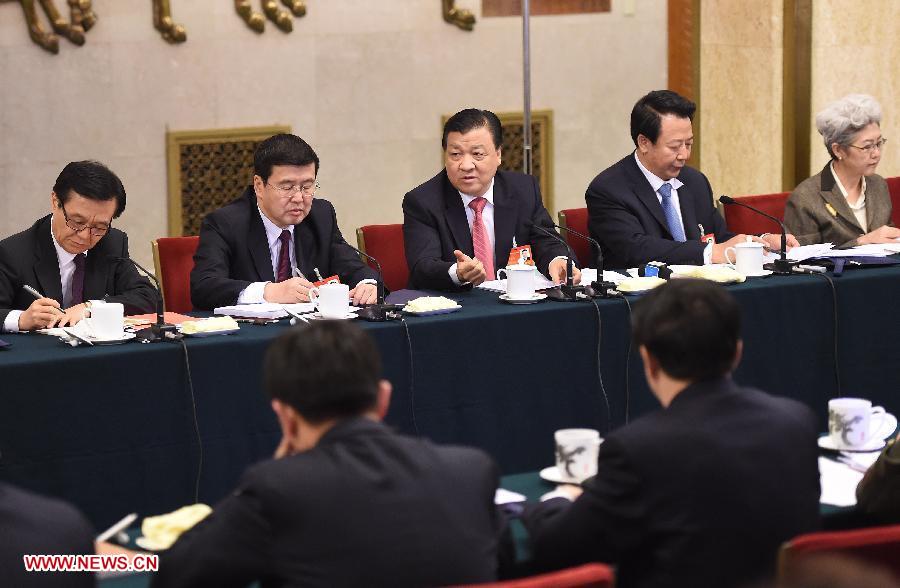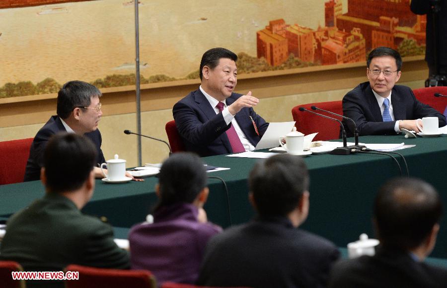 Chinese President Xi Jinping (C), also general secretary of the Communist Party of China (CPC) Central Committee and chairman of the Central Military Commission, joins a panel discussion of deputies to the 12th National People's Congress (NPC) from east China's Shanghai, in Beijing, capital of China, March 5, 2014. (Xinhua/Wang Ye)