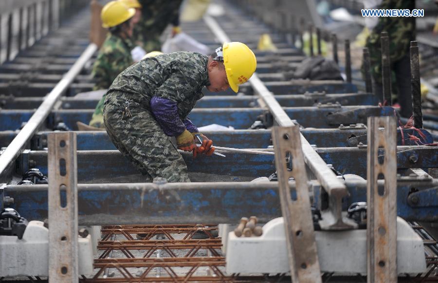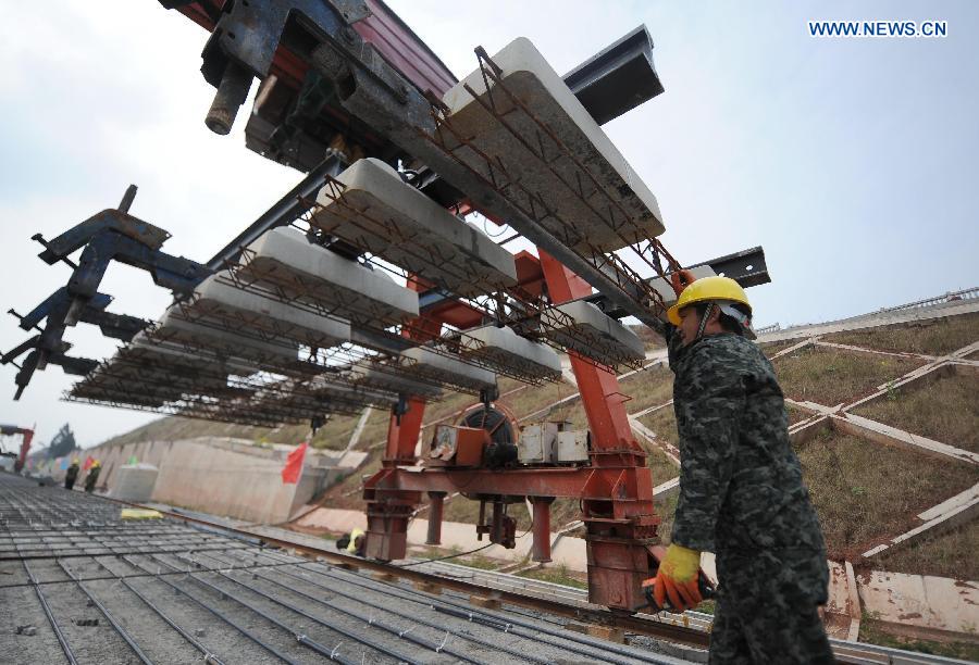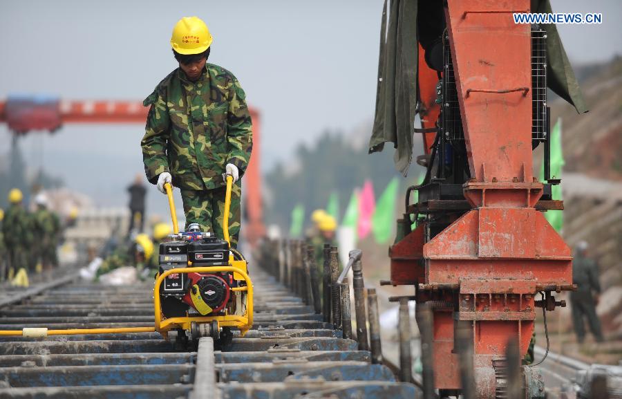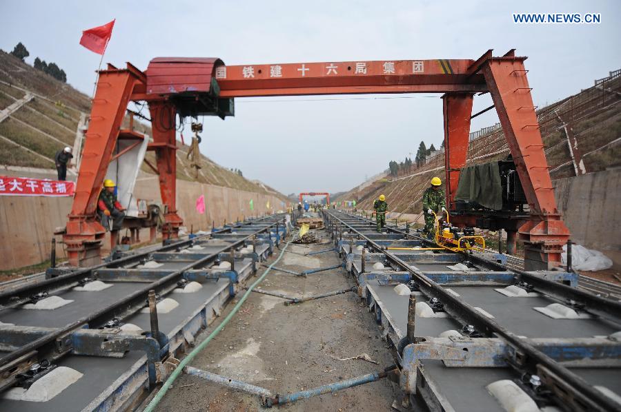 Workers work at the construction site of Chengdu-Chongqing Passenger Railway in Ziyang, southwest China's Sichuan province, March 5, 2014. The 308-km railway will reduce travel time between the two large cities to about one hour. It is part of the Shanghai-Wuhan-Chengdu Railway, or Huhanrong Railway, a major east-west high-speed rail corridor outlined in China's national high-speed railway development plan. (Xinhua/Xue Yubin)