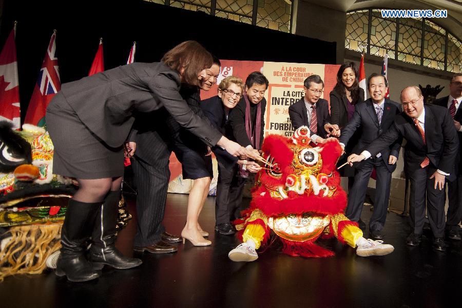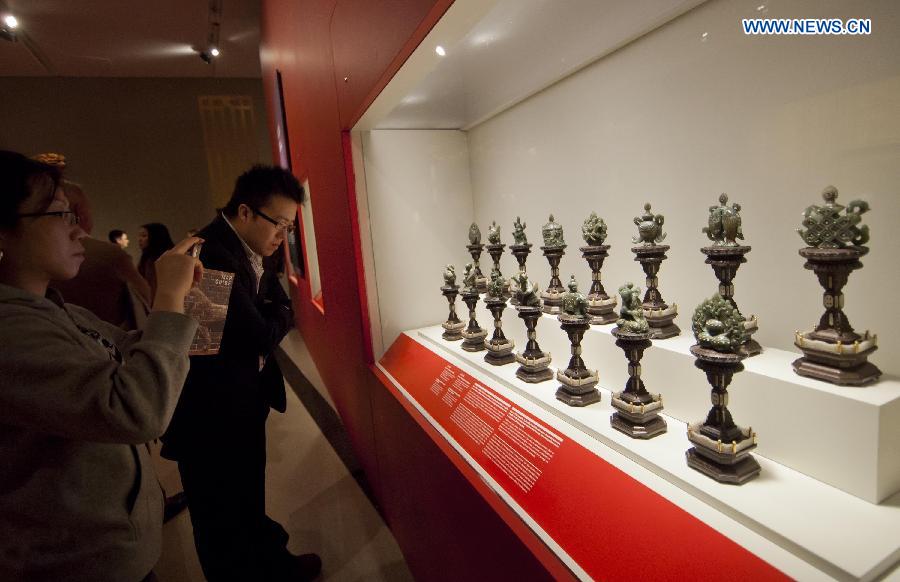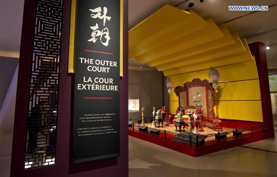 Visitors watch a vase of Qing Dynasty (1644-1911) from the Palace Museum of China during the media day of the Exhibition "The Forbidden City: Inside the Court of China's Emperors" at the Royal Ontario Museum in Toronto, Canada, March 5, 2014. This six-month exhibition brings to Canada for the first time about 250 treasures of the Palace Museum of China that were part of Chinese imperial life, and also provides an opportunity for Canadians to learn about China's long and fascinating history and traditional culture. (Xinhua/Zou Zheng)