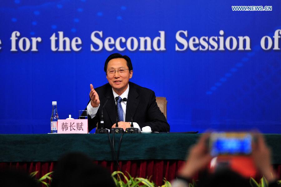 Chinese Agriculture Minister Han Changfu gives a press conference for the second session of China's 12th National People's Congress (NPC) on rural reform, in Beijing, capital of China, March 6, 2014. (Xinhua/Xiao Yijiu)