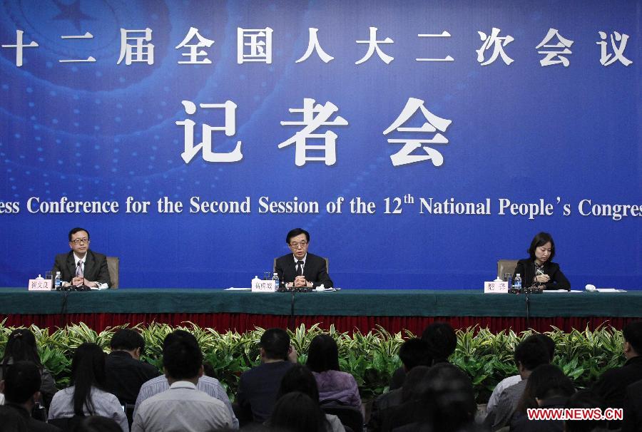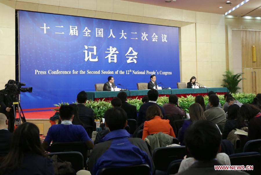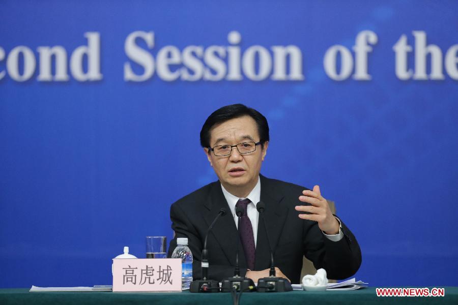 Minister of Commerce Gao Hucheng (C back) gives a press conference for the second session of China's 12th National People's Congress (NPC) on commercial development and opening up, in Beijing, capital of China, March 7, 2014. (Xinhua/Xing Guangli)