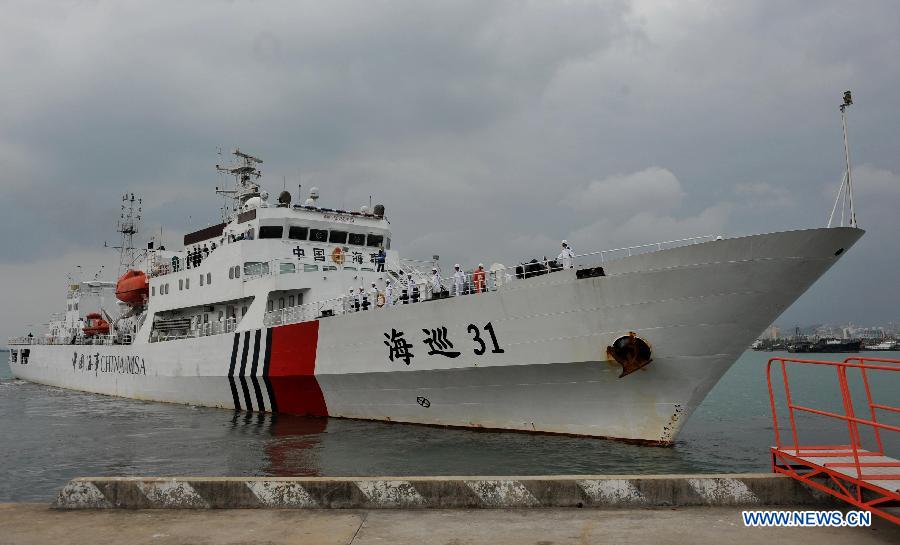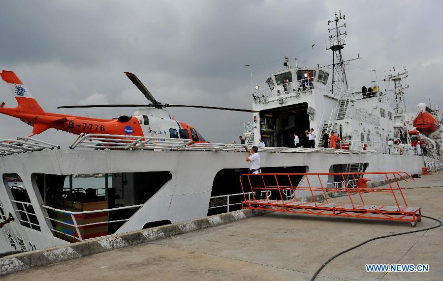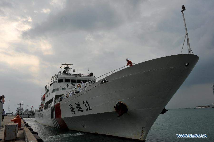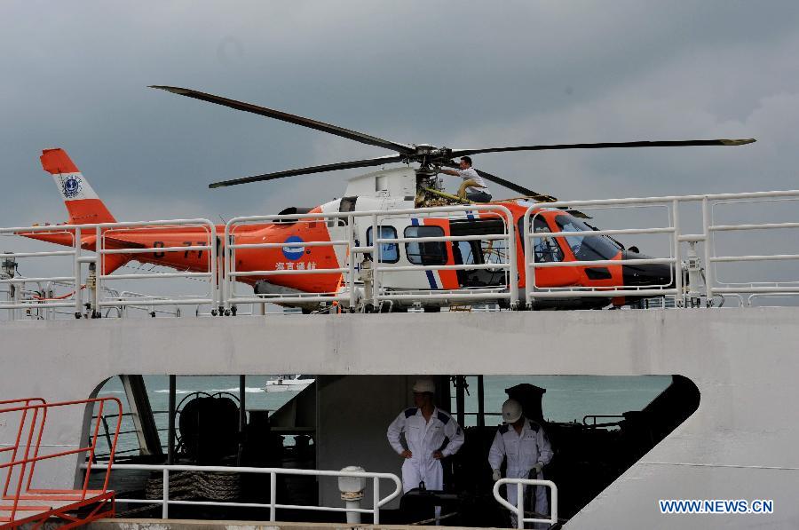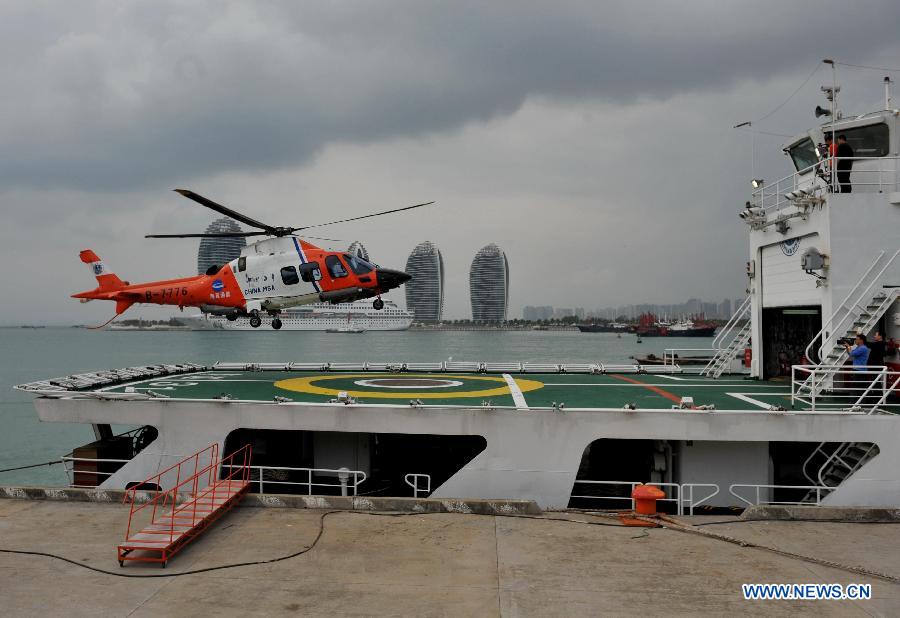 Helicopter B-7776 lands on the deck of China's patrol vessel "Haixun 31" at a port in Sanya, south China's island of Hainan Province, March 9, 2014. "Haixun 31", the largest patrol vessel in South China Sea, left here on Sunday afternoon for search and rescue mission for the missing Malaysian Airline flight. (Xinhua/Zhang Yongfeng)
