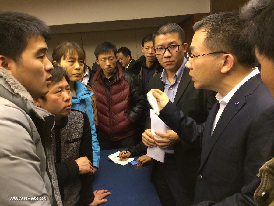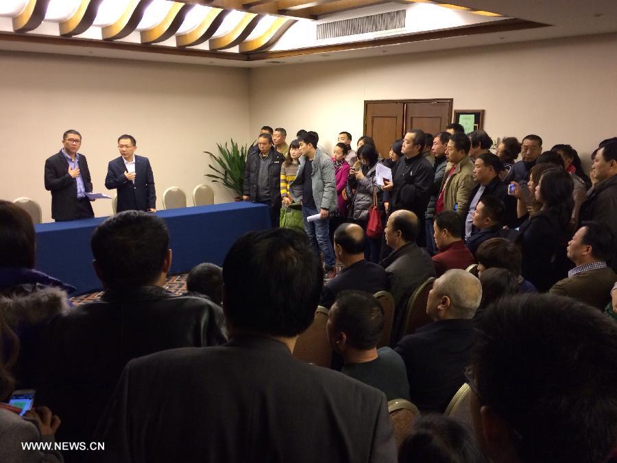 A relative (L front) of a passenger aboard the missing Malaysia Airlines flight MH370 demands quicker information disclosure at a news release conference held at Metro Park Lido Hotel in Beijing, capital of China, March 10, 2014. According to the man, an instant messaging service account of his missing family member had been logged in and out several times between late March 9 and early March 10. Relatives of passengers aboard the missing Malaysia Airlines flight MH370 attended a news release conference held here on Monday. Some refused to leave for Malaysia right now, demanding the airlines' clear response to the incident. (Xinhua/Luo Xiaoguang)