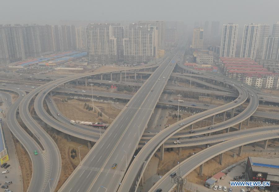 Motorcars run on a road amid smog in Shijiazhuang, capital of north China's Hebei province, March 10, 2014. Smog hit 11 cities in the province and lingered for three days since March 8. The local environmental bureau has issued yellow alert for smog for three days in a row. (Xinhua/Mo Yu)