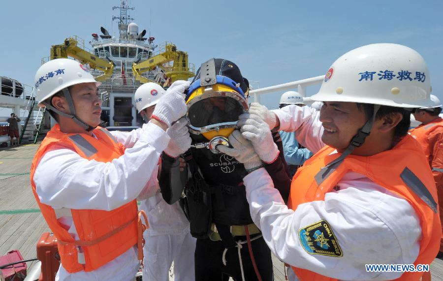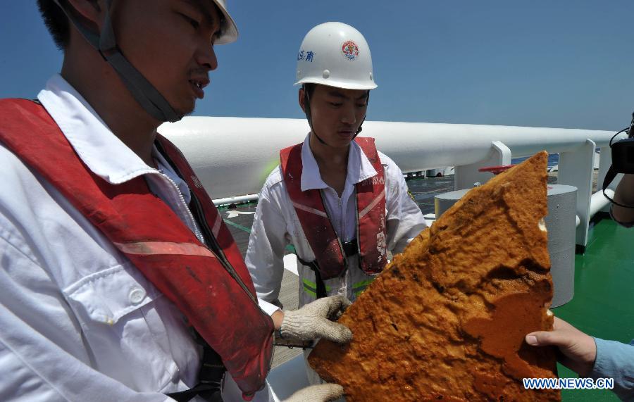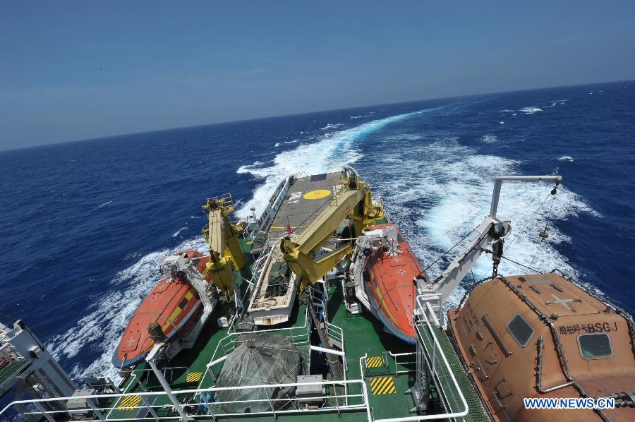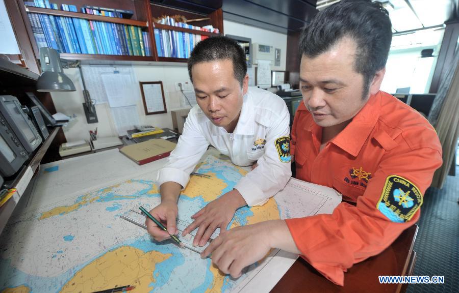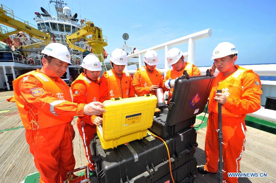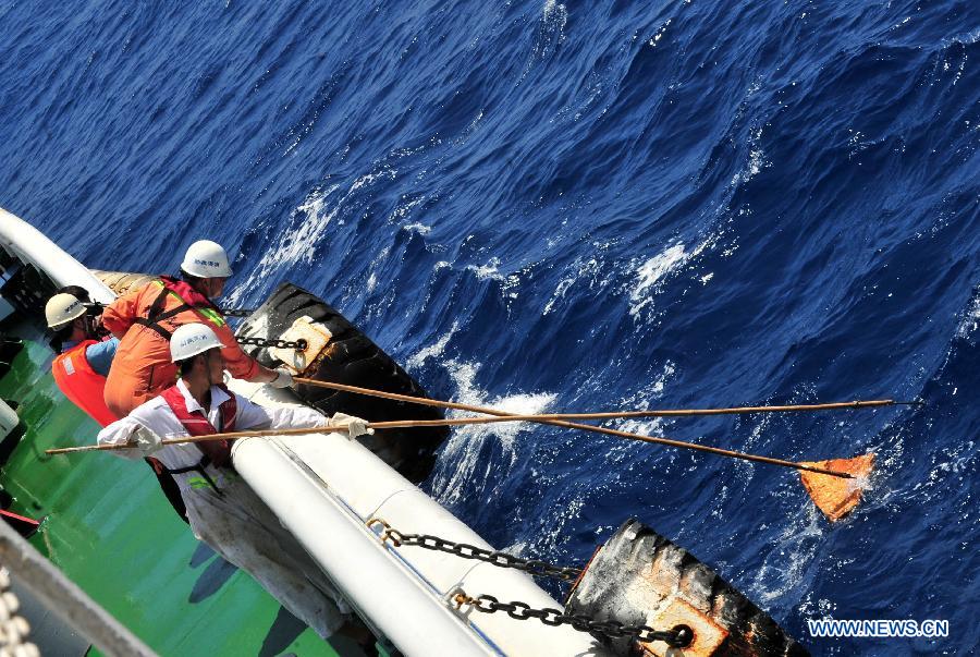 Members of the Chinese emergency response team on "South China Sea Rescue 101" salvage floating object at the possible crash site of missing Malaysia Airlines flight MH370. Five Chinese rescue vessels, including "South China Sea Rescue 115" and "South China Sea Rescue 101", have all arrived at the possible crash site as of Tuesday and immediately started the search mission for missing flight MH370. (Xinhua/Zhao Yingquan)
