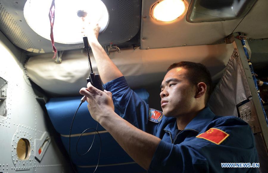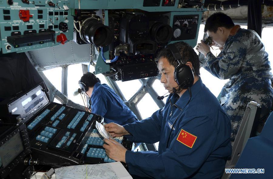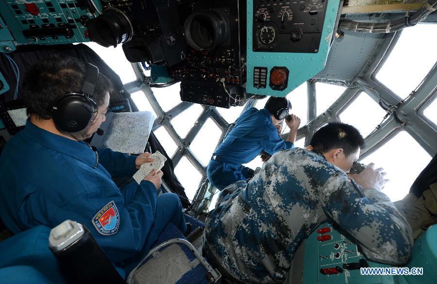 Crew members operate on a Chinese Air Force aircraft above sea areas where the missing Malaysia Airlines flight MH370 lost contact, Malaysia, March 12, 2014. Multinational search operation to locate missing Malaysia Airlines flight MH370 has been expanded to two areas with more countries joining in the mission. (Xinhua/Shen Ling)