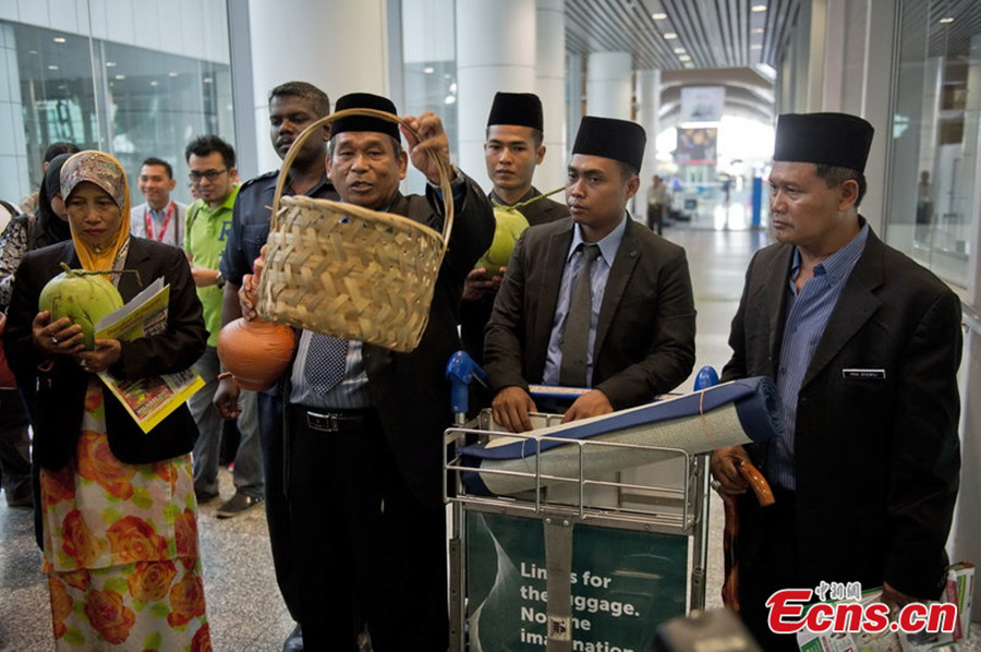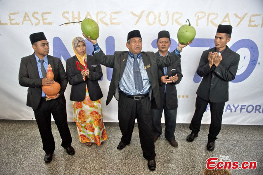 Ibrahim Mat Zin (R1), a famous "bomoh," or shaman, also known as the Raja Bomoh Sedunia Nujum VIP, performs a prayer at Kuala Lumpur International Airport in Malaysia to help locate the missing MH370 flight on Mar. 12, 2014 (local time). The Raja Bomoh claims to be invited by one of the country's top leaders. [Photo/CFP]