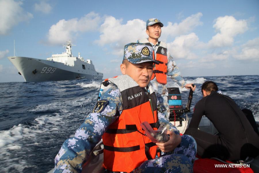 A helicopter takes off from the Chinese naval vessel Jianggangshan to carry out search at the possible crash site of missing Malaysia Airlines flight MH370, March 13, 2014. As of 12 a.m. (0400 GMT) Thursday, Chinese search teams had searched 45,763 square kilometers, no solid clues were located. (Xinhua/Gan Jun)