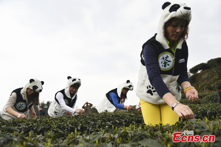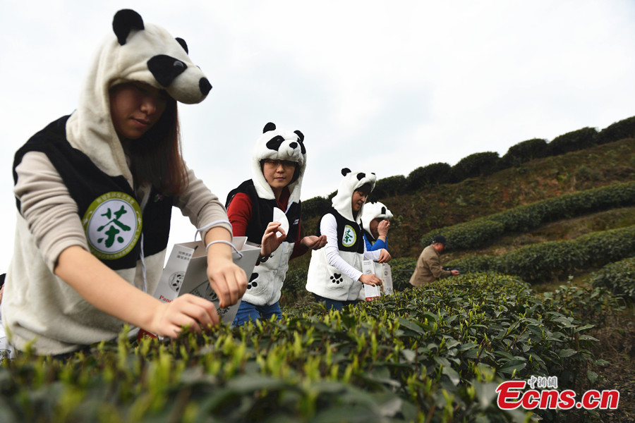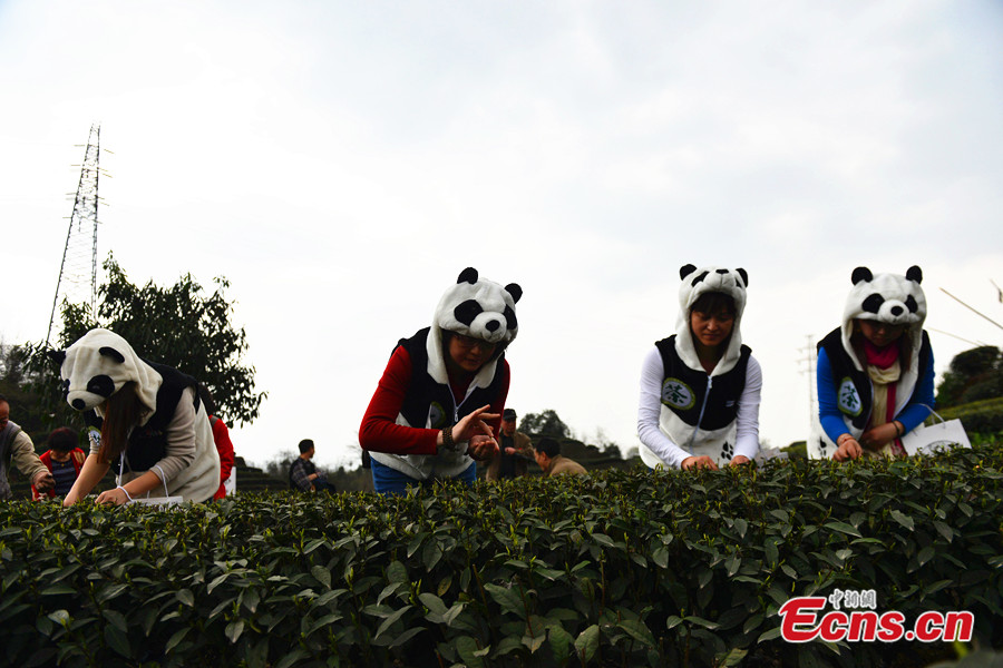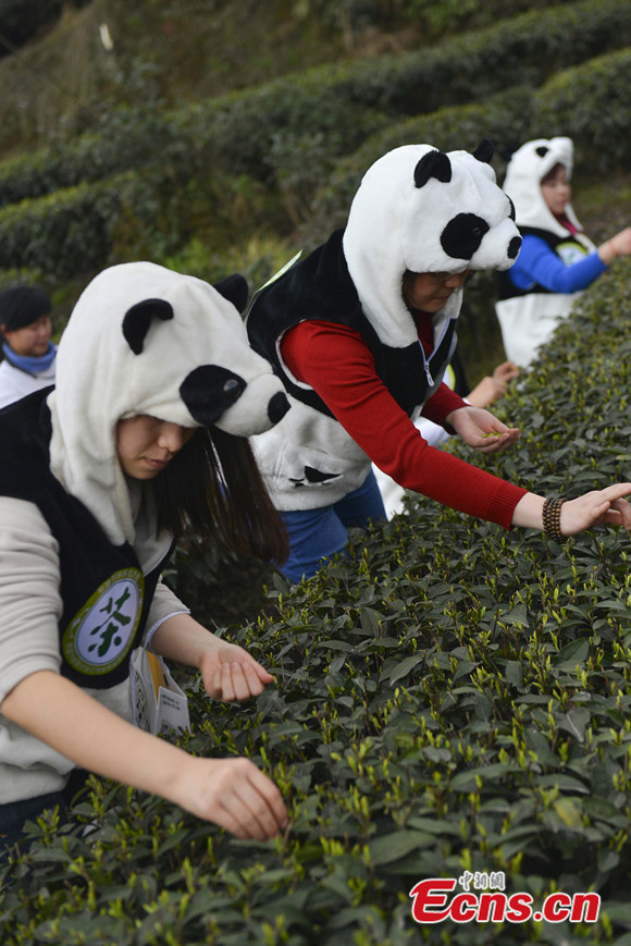 Chinese women in panda costumes pick "Panda Tea" at a plantation in Ya'an of southwest China's Sichuan province on March 12, 2014. The tea was fertilized with panda feces which are said to be highly nutritious, and the tea sells for about 440,000 yuan per kilogram.[Photo: China News Service / Zhang Lang]