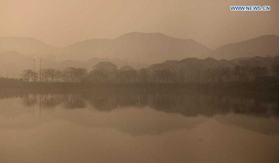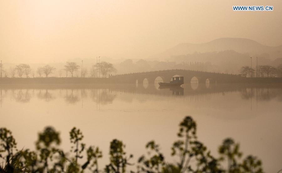 Photo taken on March 14, 2014 shows the mist-covered Donghu Lake, which is a part of the Poyang Lake, in Duchang County of Jiujiang, east China's Jiangxi province. (Xinhua/Fu Jianbin)