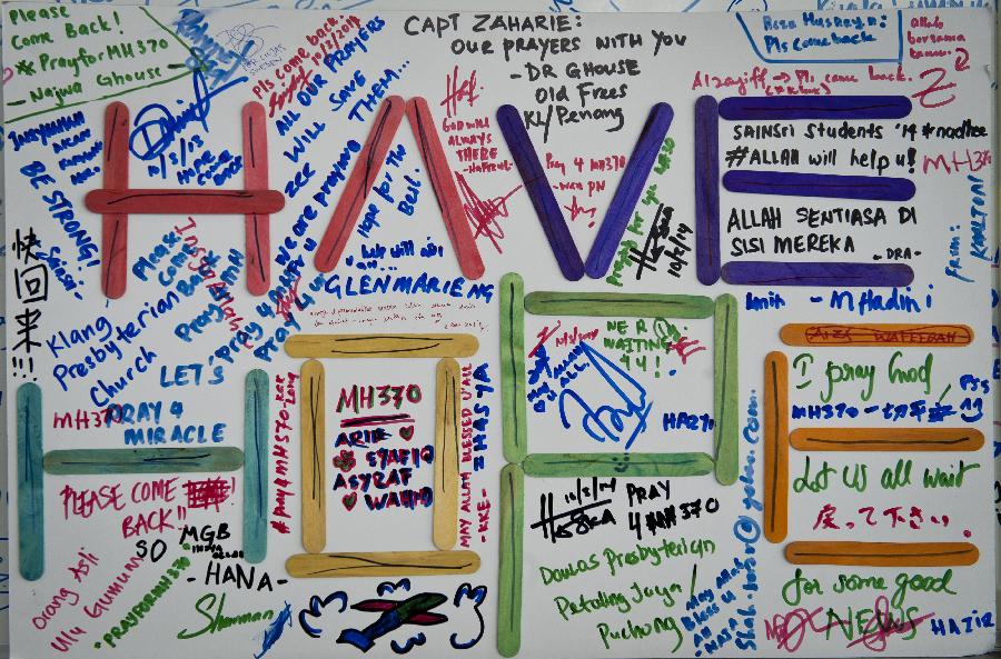 A woman sticks her message of well wishes dedicated to all involved with the missing Malaysian aircraft to a banner, during a praying ceremony organized by a local TV channel, in Kuala Lumpur, Malaysia, March 13, 2014. (Xinhua/Zhang Wenzong)