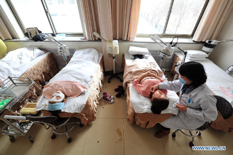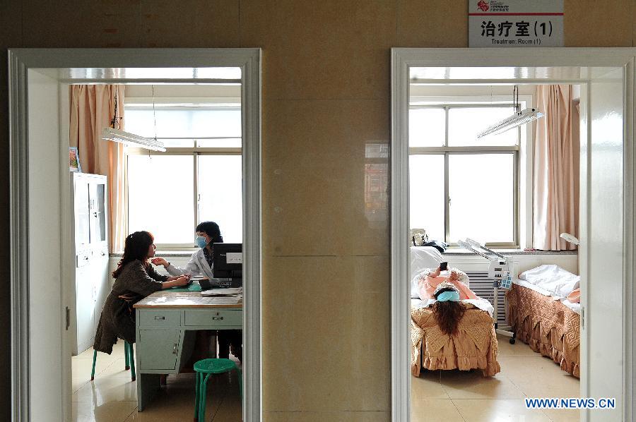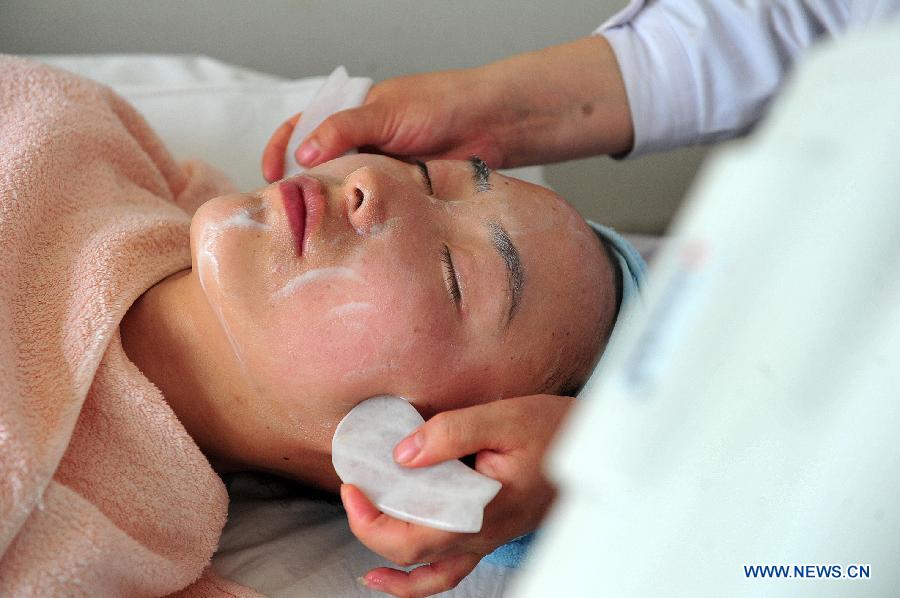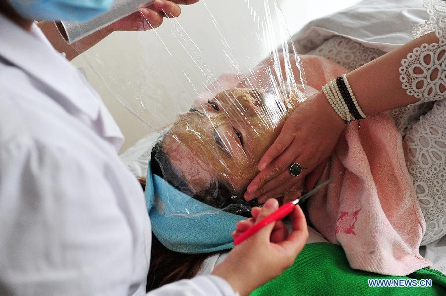 A patient receives acne treatment by a doctor of Traditional Chinese Medicine (TCM) at a TCM clinic for beauty therapy in Yinchuan, capital of northwest China's Ningxia Hui Autonomous Region, March 17, 2014. The TCM beauty therapy became much popular in Ningxia in recent years. (Xinhua/Peng Zhaozhi)
