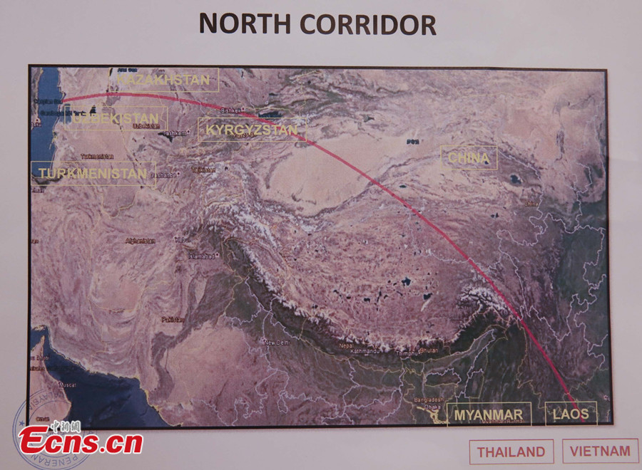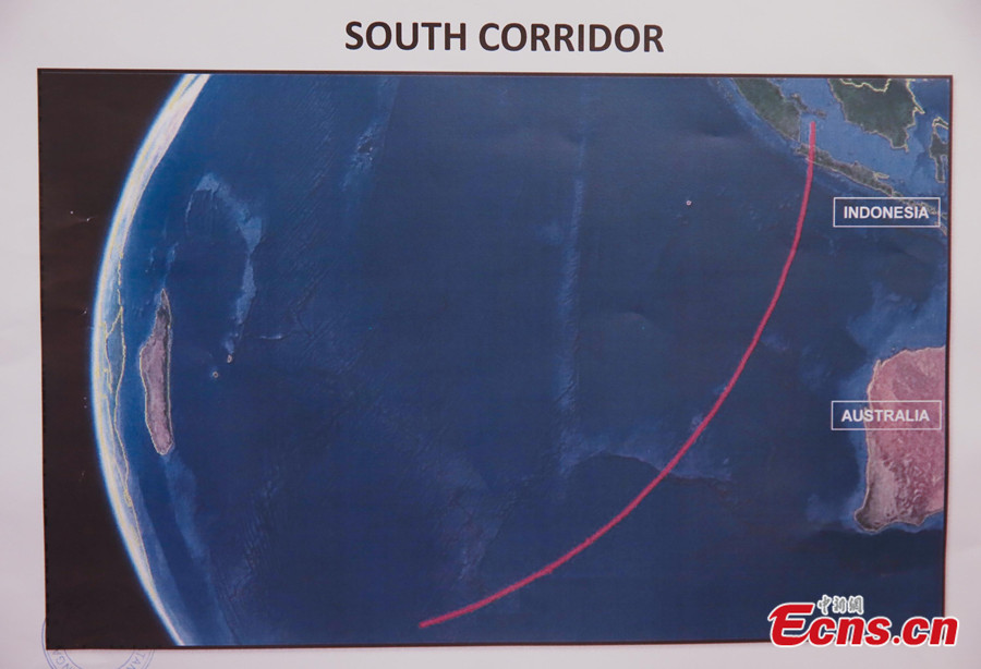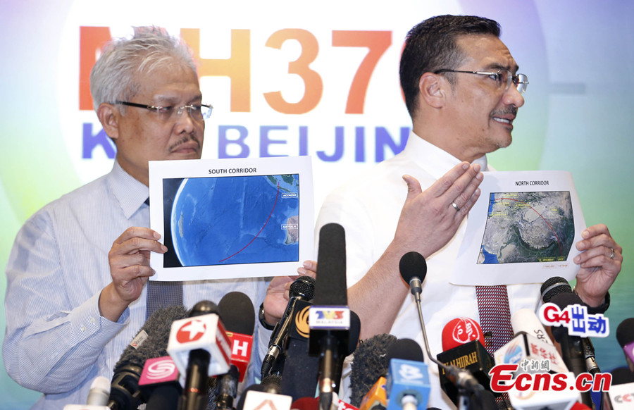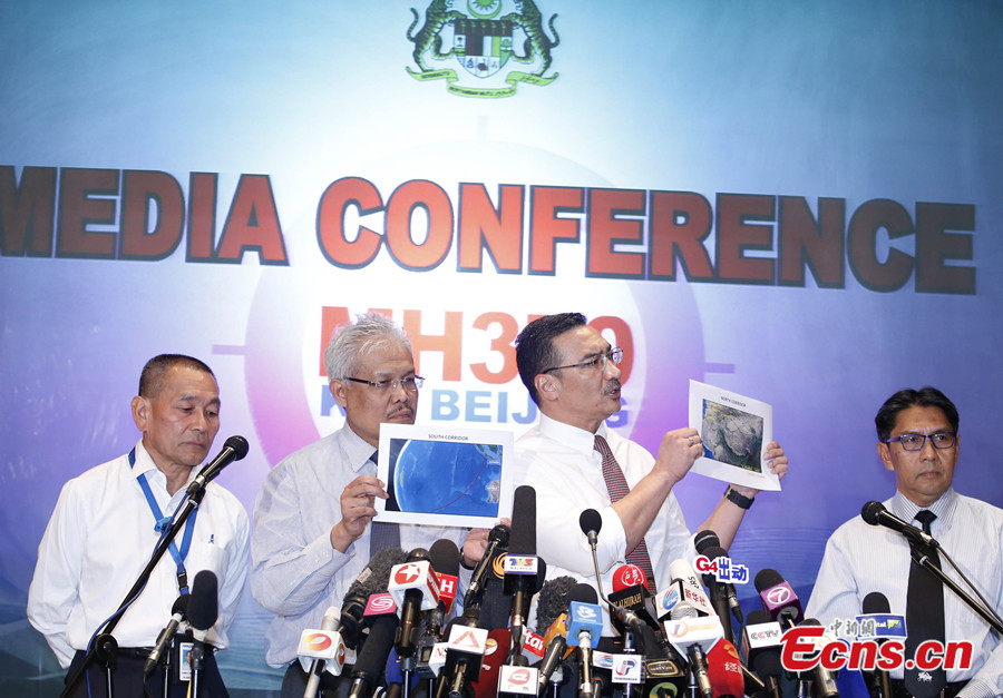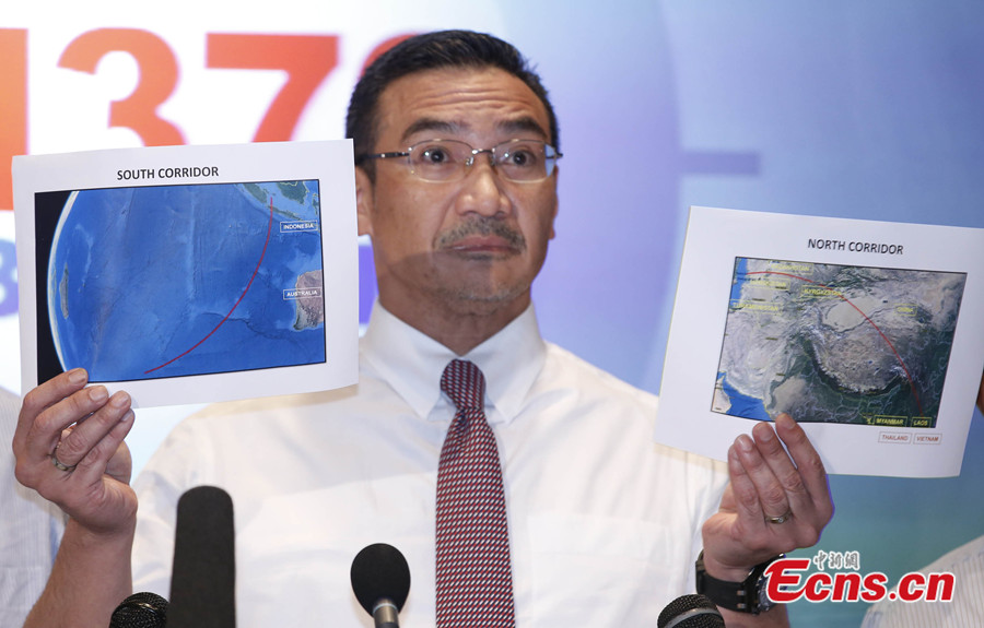 Malaysia's acting Transport Minister Hishammuddin Hussein shows two satellite maps of the possible location of the missing Malaysia Airlines flight MH370 during a press conference held at a hotel near Kuala Lumpur International Airport in Kuala Lumpur, Malaysia, March 17, 2014. From the information provided at the press conference, it appears that the jet may have reached as far as the Caspian Sea. [Photo: China News Service / Liu Guanguan]