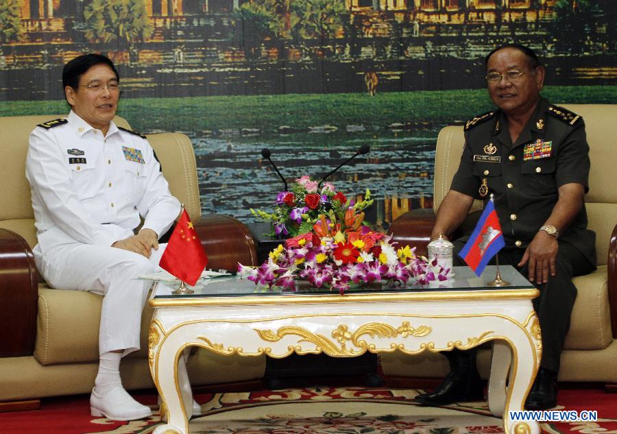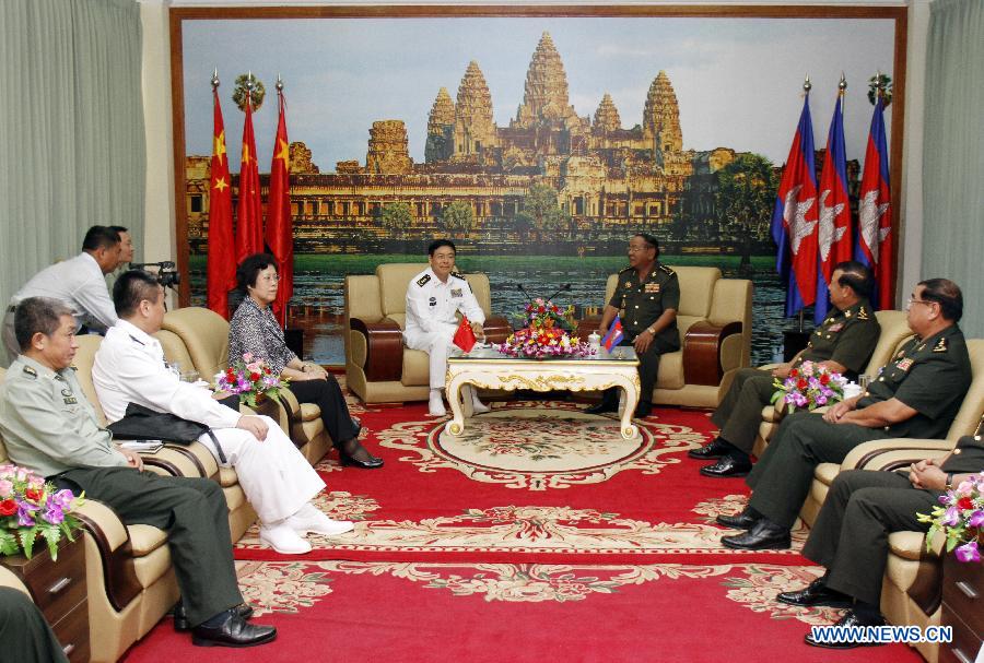 Sun Jianguo (back L), deputy chief of general staff of the Chinese People's Liberation Army and chairman of the China Institute for International Strategic Studies meets with Royal Cambodian Armed Forces (RCAF)'s commander-in-chief Gen. Pol Saroeun (back R) in Phnom Penh, Cambodia, March 17, 2014. Cambodian and Chinese senior military officials on Monday vowed to deepen bilateral ties and cooperation for mutual benefits. (Xinhua/Sovannara)