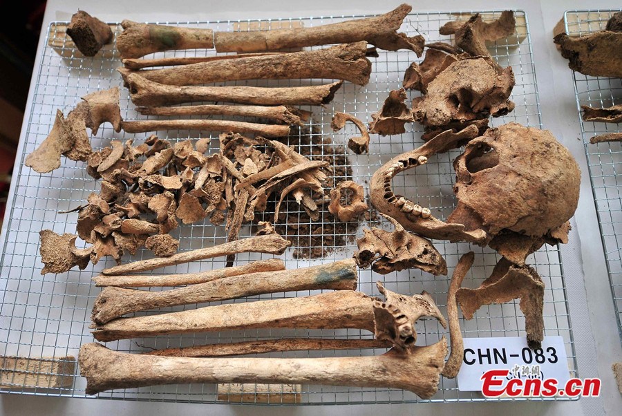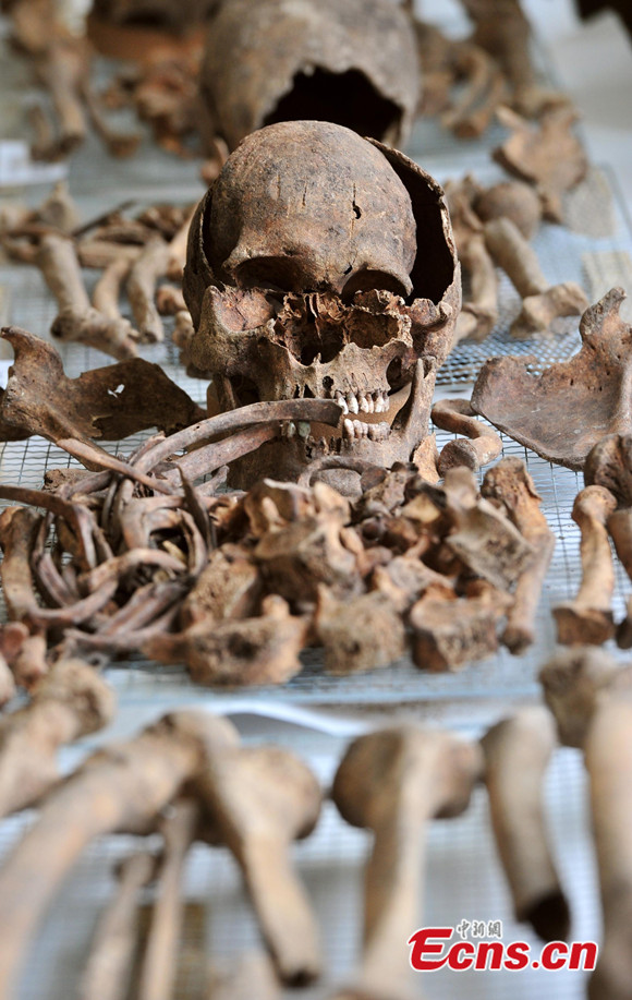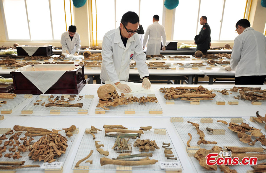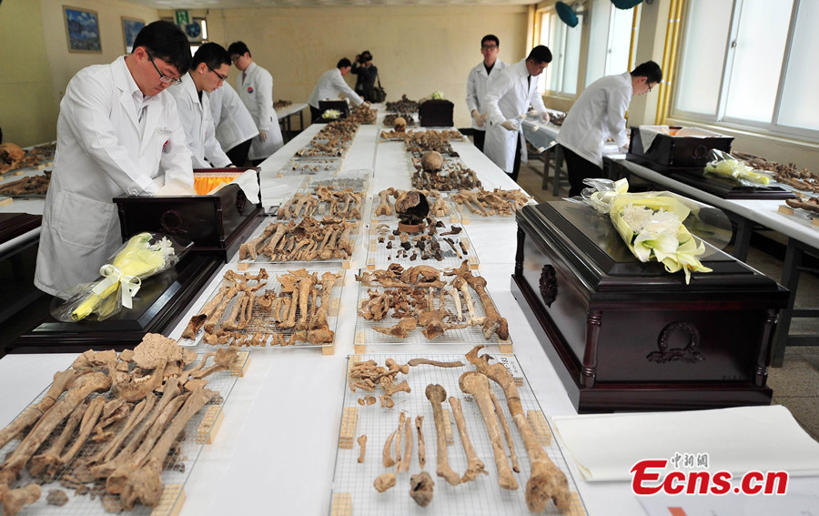 The remains of 437 Chinese soldiers killed during the 1950-53 Korean War are placed in coffins during the rites held at an army base in Paju of South Korea on Mar. 17, 2014. The remains will be returned to China from South Korea at the end of March for a permanent burial. [Photo/ Reuters]