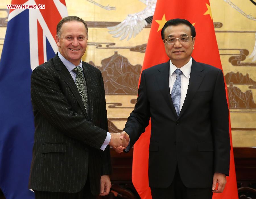 Chinese Premier Li Keqiang (R) holds talks with visiting New Zealand's Prime Minister John Key in Beijing, capital of China, March 18, 2014. John Key is paying a working visit to China from March 18 to 20 at Li's invitation. (Xinhua/Pang Xinglei)