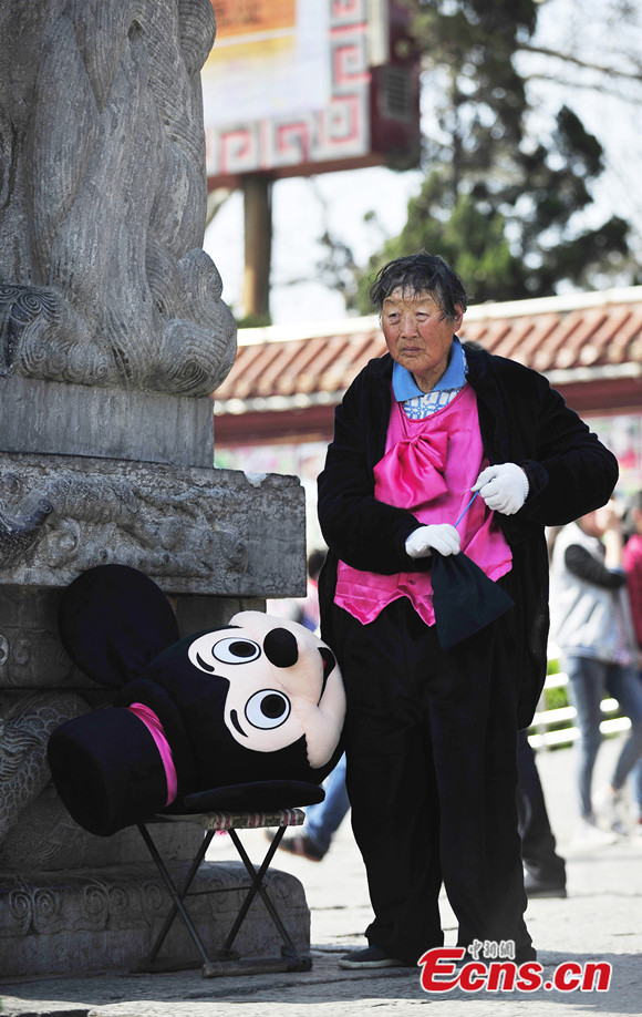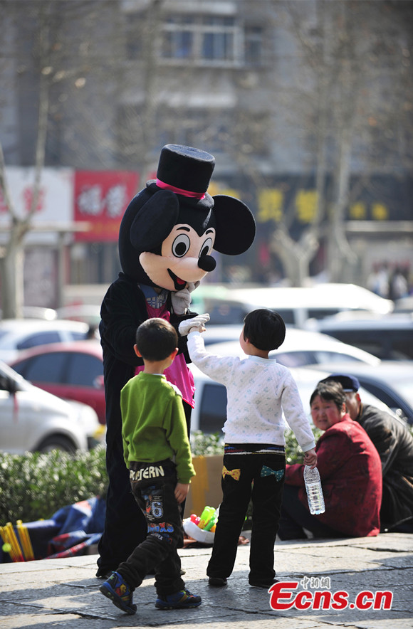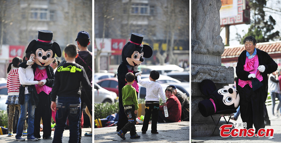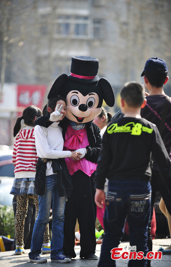 A visitor poses for photos with a Mickey Mouse at a square in front of Wangcheng Park in Luoyang of Henan province on Mar. 16, 2014. The Mickey Mouse is dressed up by a 75-year-old woman, who charges visitors from one to five yuan (US$0.16 – 0.8) for taking her photograph. [Photo/IC]