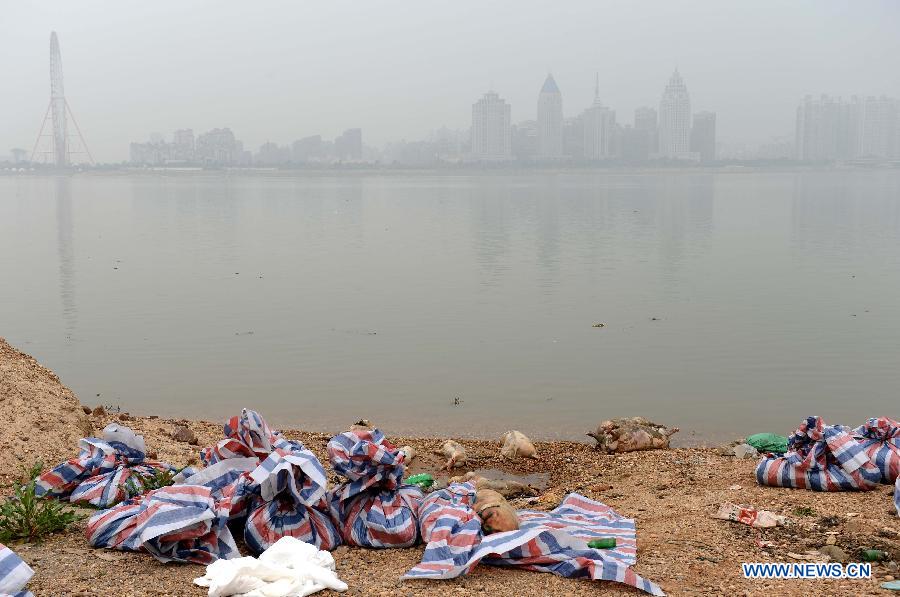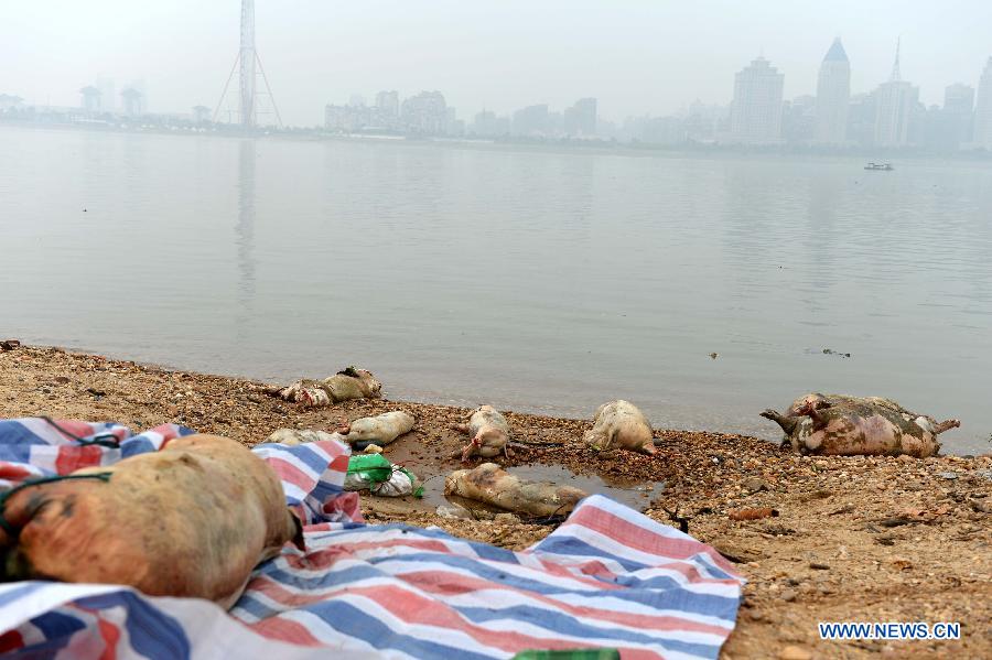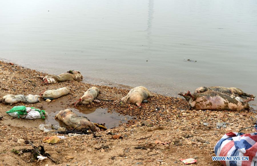 Dead pigs are collected from a section of the Ganjiang River in Nanchang, capital of east China's Jiangxi Province, March 19, 2014. As of Tuesday afternoon, 131 dead pigs had been collected from the Ganjiang River which provides drinking water to the provincial capital. Collecting efforts are still under way in the river. Examination of all water intakes in the city by the environmental and health authorities showed that the tap water is safe for drinking, according to local government. (Xinhua/Chen Zixia)