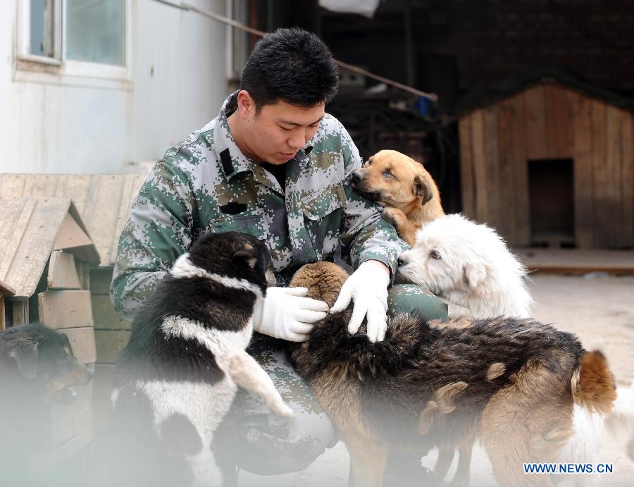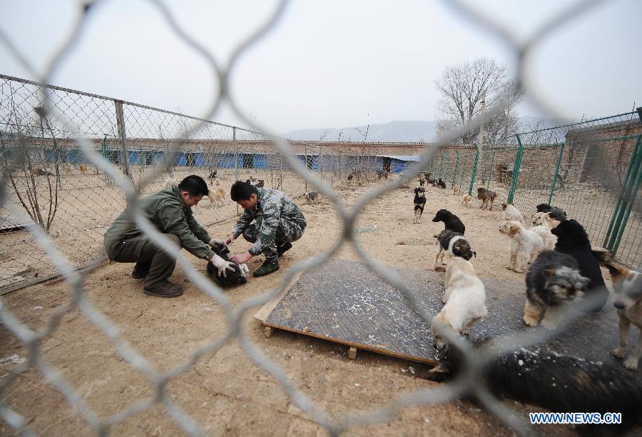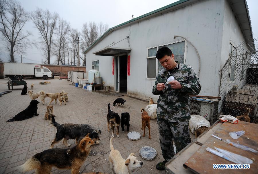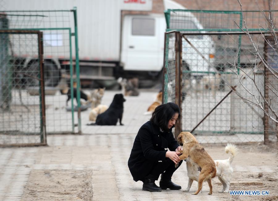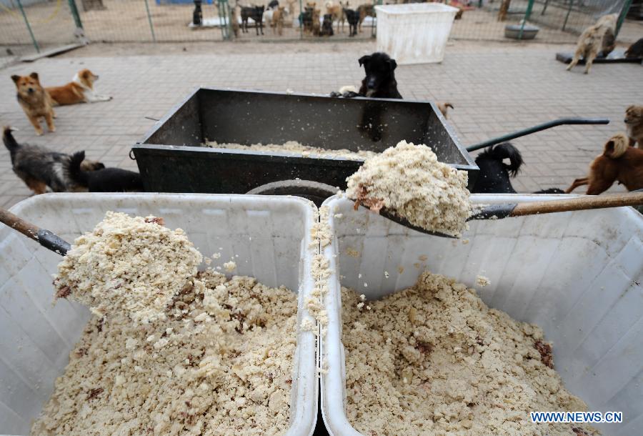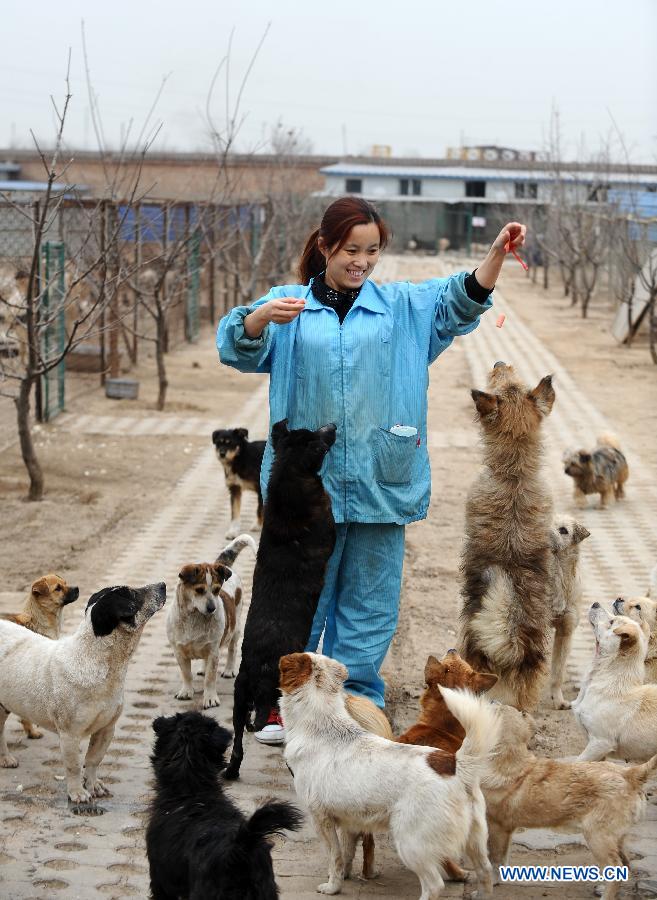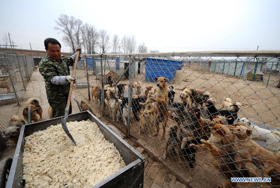 A worker feeds dogs at a stray dog shelter in Taiyuan, capital of north China's Shanxi Province, March 18, 2014. The shelter was home for some 300 stray dogs when it was founded by dog lovers in 2011. However, it is facing difficulties as the number of strays is constantly on the rise. By far, over 2,000 dogs are hosted in the shelter. Tight budgets for health care, bacterin and dog food are pressuring the owner to find a solution. Through social media tools like Weibo and Wechat, a popular instant messaging service in China, the shelter searches for social support and hope it could ease the trouble. (Xinhua/Yan Yan)