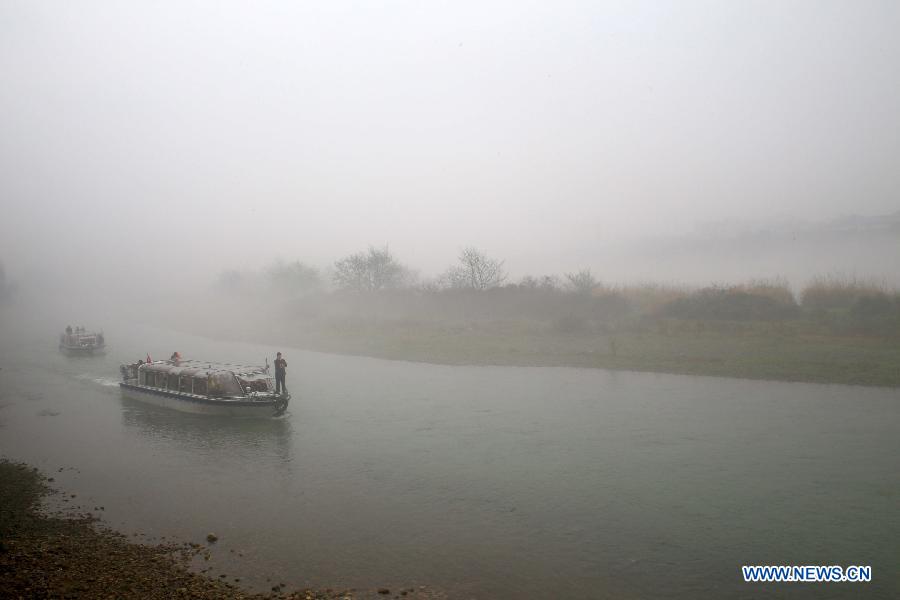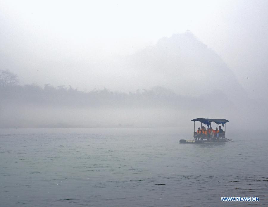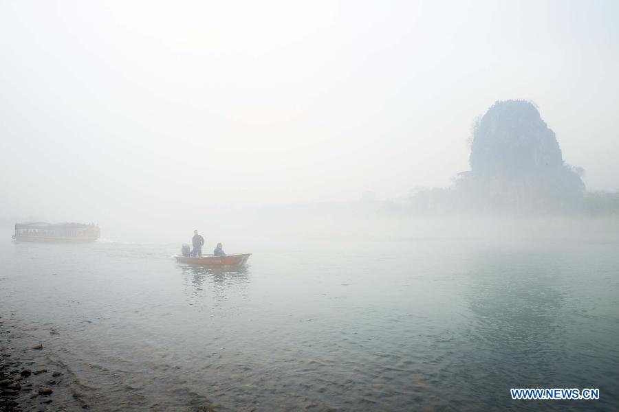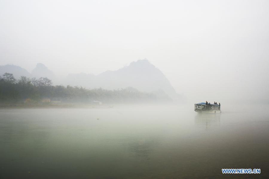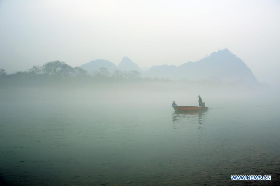Photo taken on March 19, 2014 shows the misty Lijiang River in Guilin, south China's Guangxi Zhuang Autonomous Region. The Lijiang River has often been permeated with mist in the morning since February. (Xinhua/Wang Cuirong)