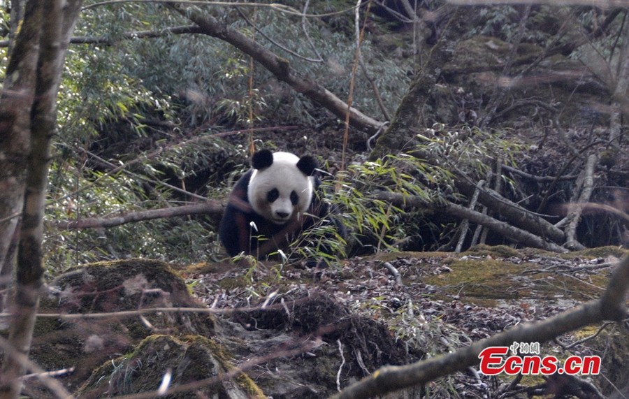 A wild giant panda is pictured at Tangjiahe National Nature Reserve in Qingchuan of southwest China's Sichuan province on Mar. 18, 2014, the nature reserve said on Wednesday. [Photo/China News Service]