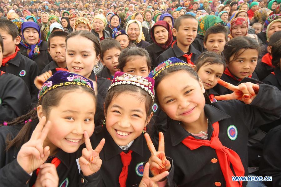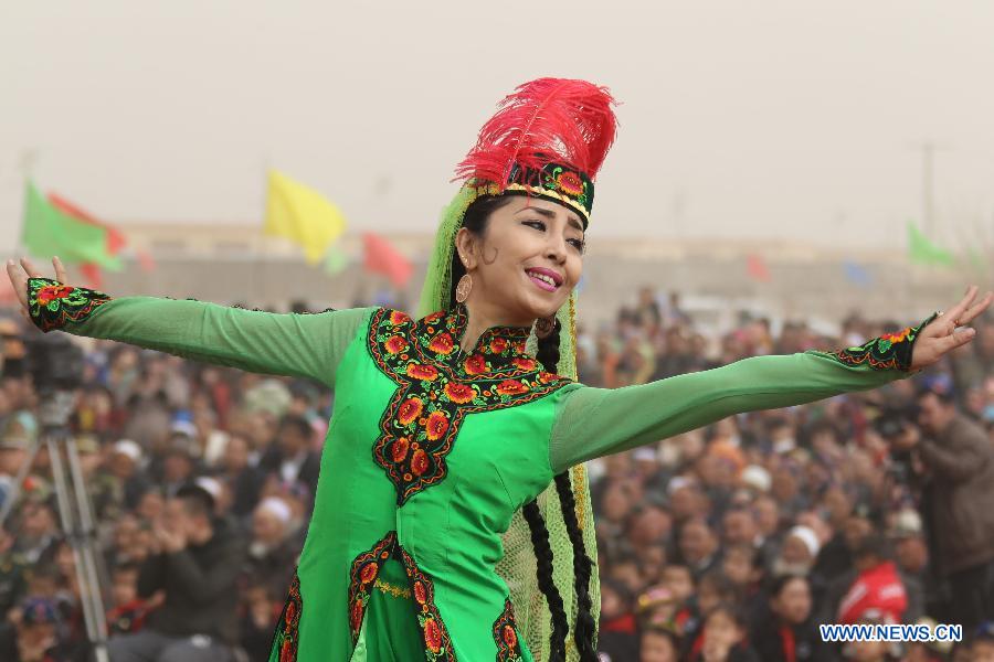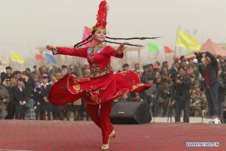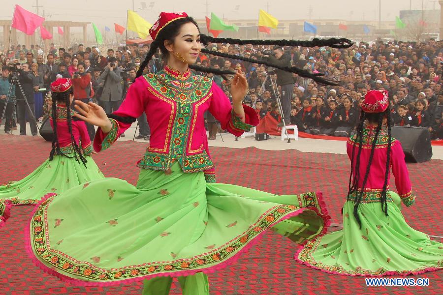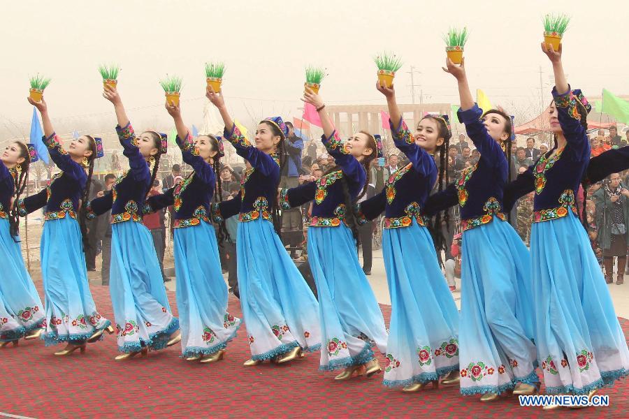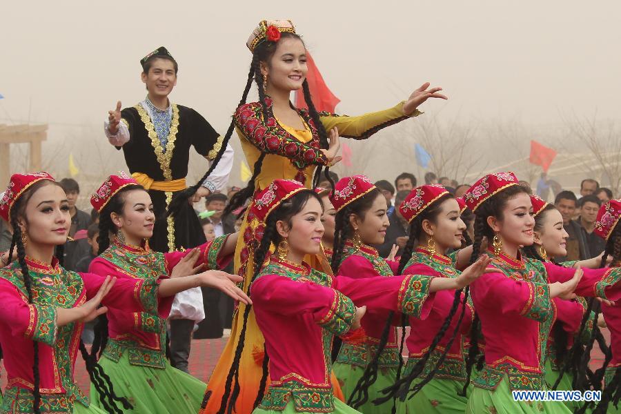 Girls of Uygur ethnic group dance to celebrate the Noruz Festival marking the start of spring plowing in Wupu Township, Hami, northwest China's Xinjiang Uygur Autonomous Region, March 19, 2014. The Noruz Festival is one of the most significant festivals shared by various ethnic groups in Xinjiang. (Xinhua/Cai Zengle)