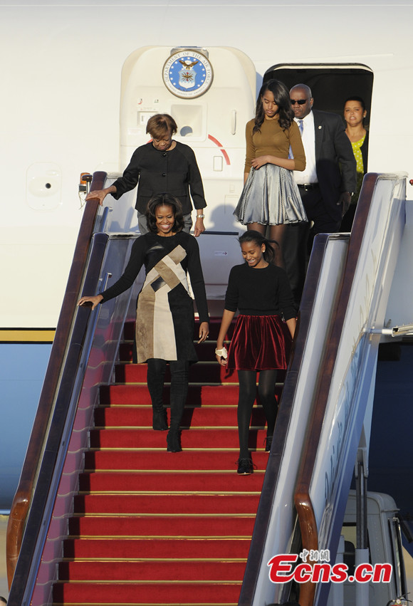 US first lady Michelle Obama, followed by her daughters Malia and Sasha, lands in Beijing on Thursday evening, starting her weeklong, three-city tour of China. [Photo/Hou Yu]