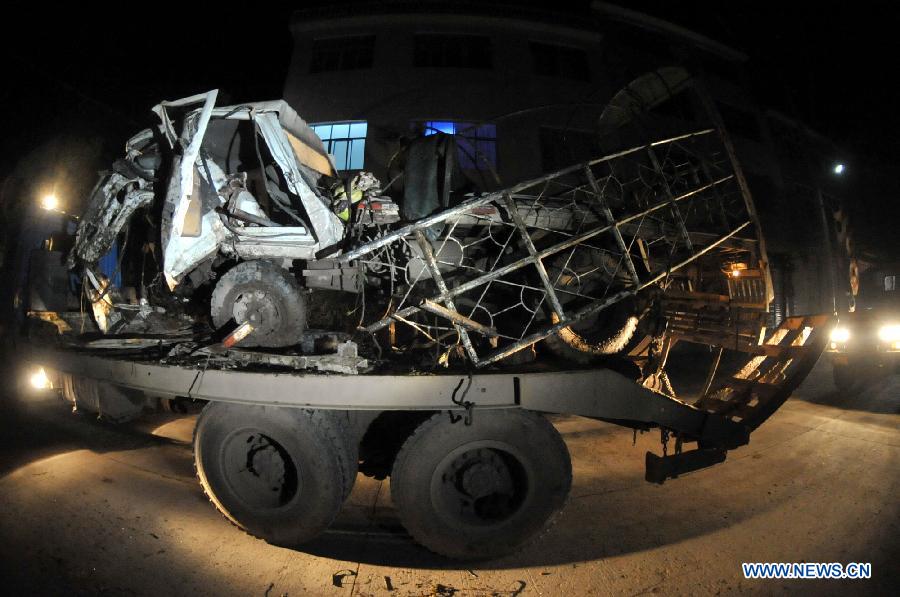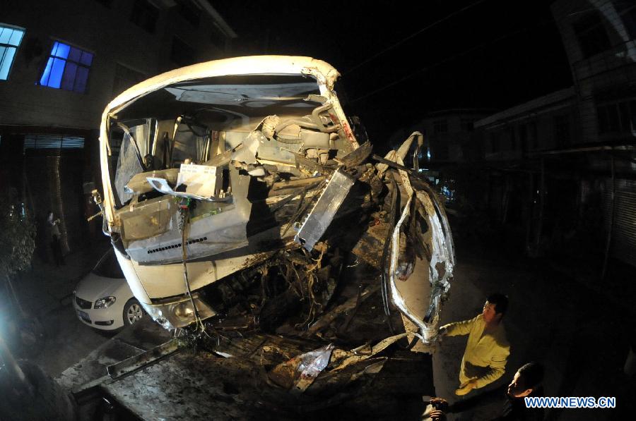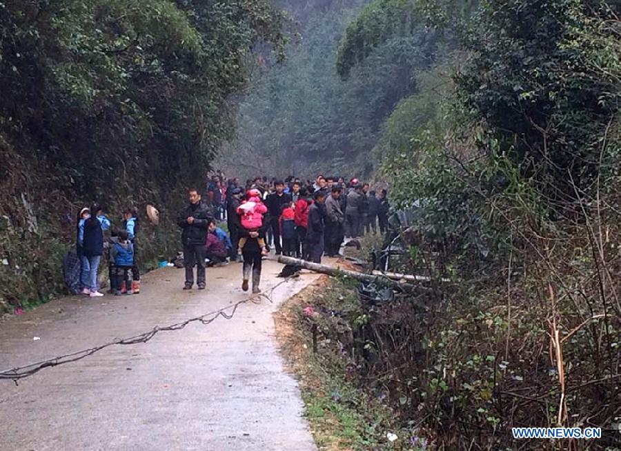 Snapshot taken from a video shows a road accident site in the Mayang County under Huaihua City, central China's Hunan Province, March 20, 2014. Six people died and 16 were injured when a farm vehicle fell into a valley in a village of Mayang Miao Autonomous County under Huaihua City Thursday morning. Rescuers have rushed to the site and the injured have been sent to hospital for treatment. The cause of the accident is still unknown. (Xinhua)