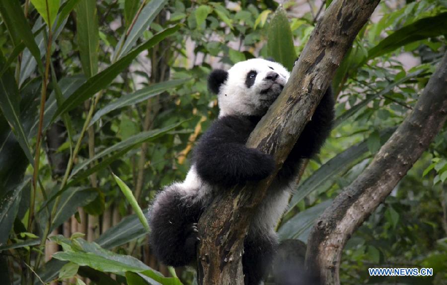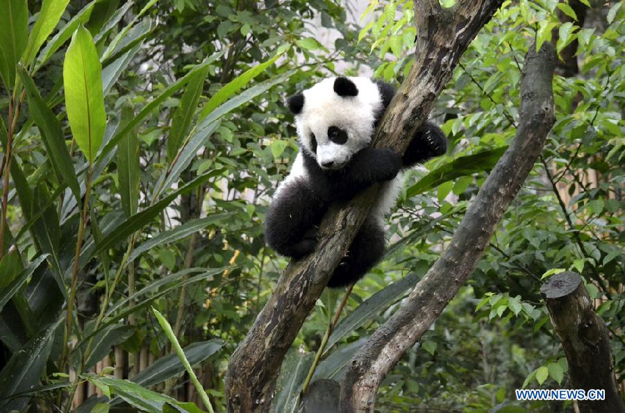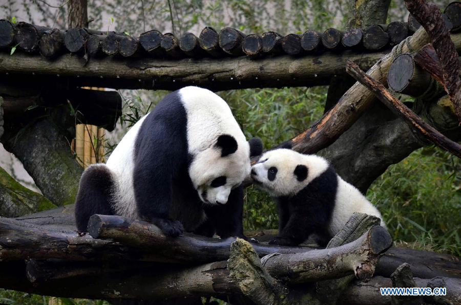 Giant panda cub "Yuanzai" plays with its mother "Yuanyuan" during their outdoor activity at the Taipei Zoo in Taipei, southeast China's Taiwan, March 20, 2014. (Xinhua/Taipei Zoo)