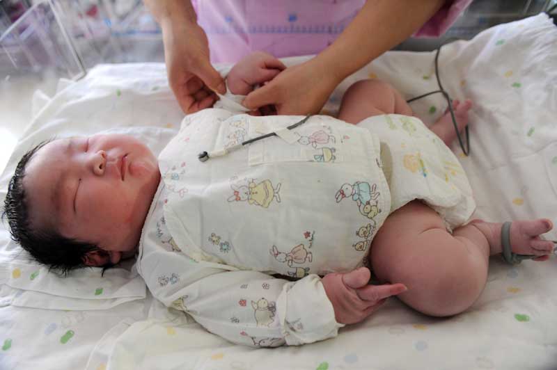 A nurse cares for a newborn baby weighing 6.25 kg at a hospital in Changchun, Jilin province,March 18, 2014. The baby, the second child of a 36-year-old mother, was delivered by cesarean section 10 days ahead of the due date but weighed as much as an average 3-month-old. [Photo by Kan Xuan / for China Daily]
