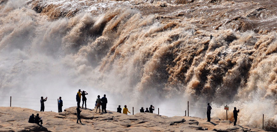 Hukou Waterfall in the Yellow River attracts visitors to Jixian county, Shanxi province, on Sunday, as the river's size swells due to thawing ice upstream. The tide will reach downstream, sending the message of spring.[Photo by Lyu Guiming/for China Daily]