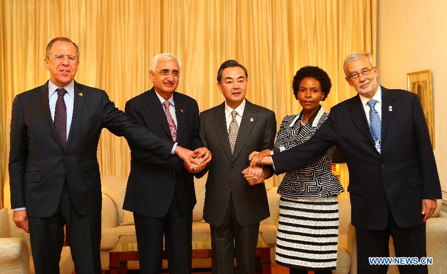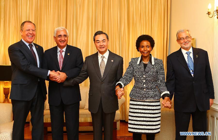 (L to R) Russian Foreign Minister Sergei Lavrov, Indian External Affairs Minister Shri Salman Khurshid, Chinese Foreign Minister Wang Yi, South African Minister of International Relations and Cooperation Maite Nkoana-Mashabane and Undersecretary-General for Political Affairs, Ambassador Carlos Antonio Paranhos of Brazil, pose for photo before a BRICS meeting of foreign ministers during the 2014 Nuclear Security Summit in The Hague, the Netherlands, March 24, 2014. (Xinhua/Gong Bing)