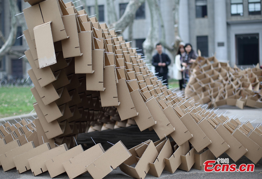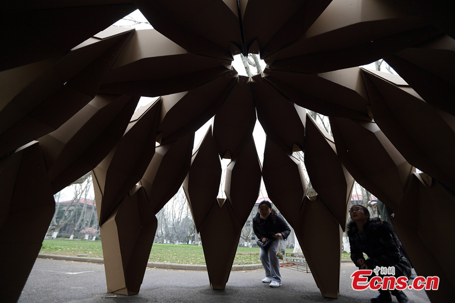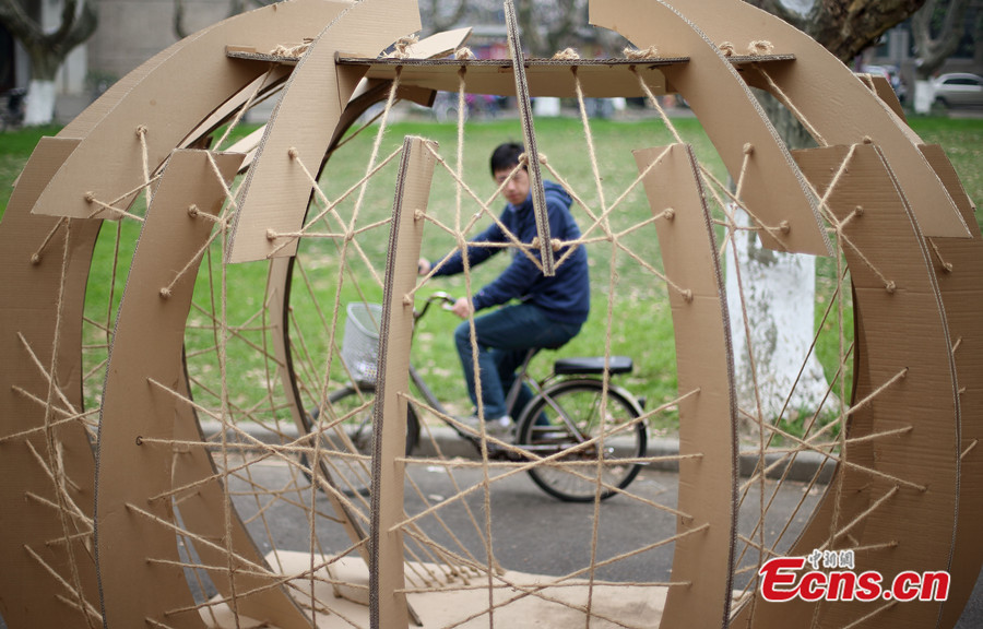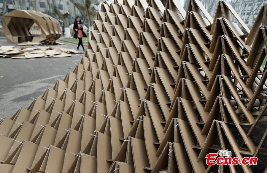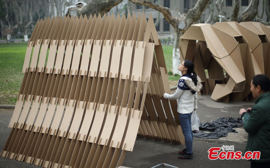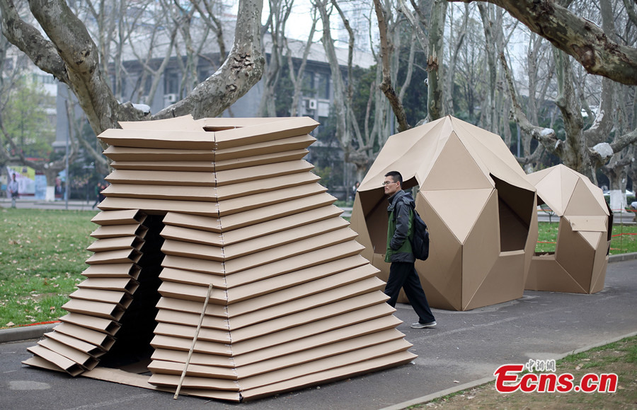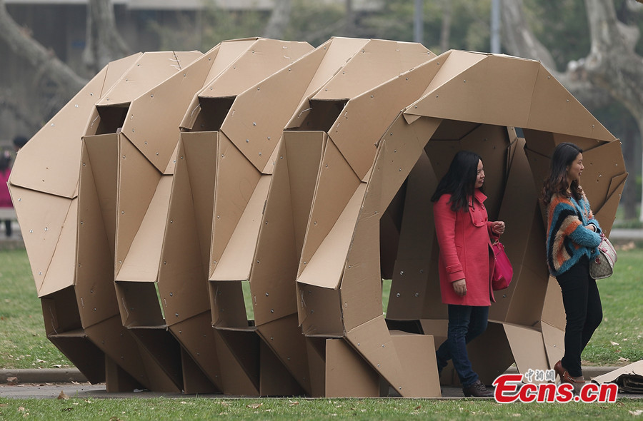 A total of 43 "paperboard houses", made by freshmen from School of Architecture, are exhibited at Southeast University in Nanjing of Jiangsu province on Mar. 24, 2014. [Photo: China News Service / Yang Bo]
