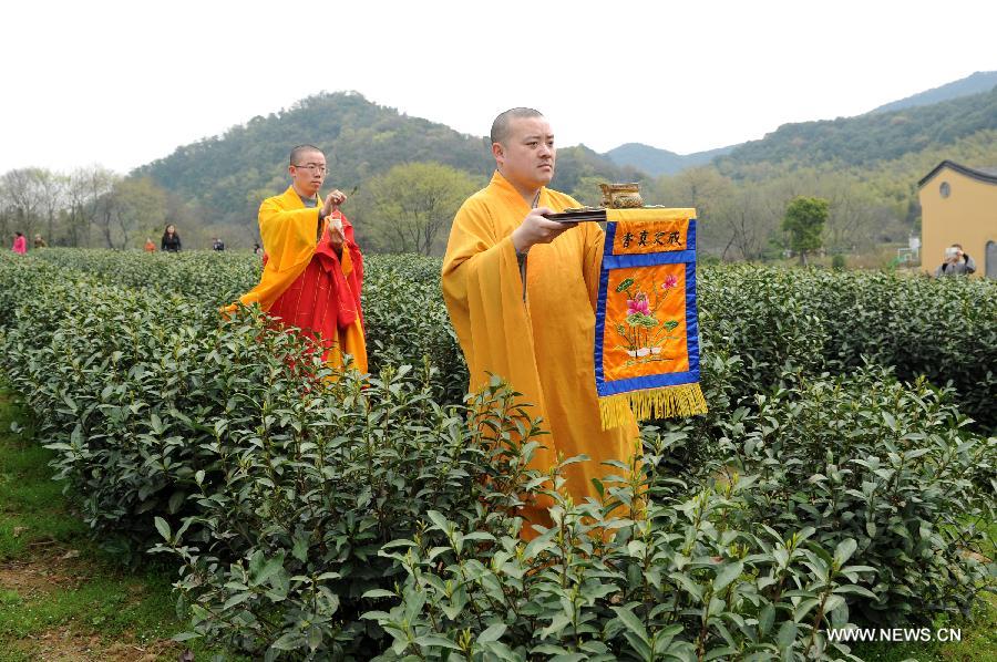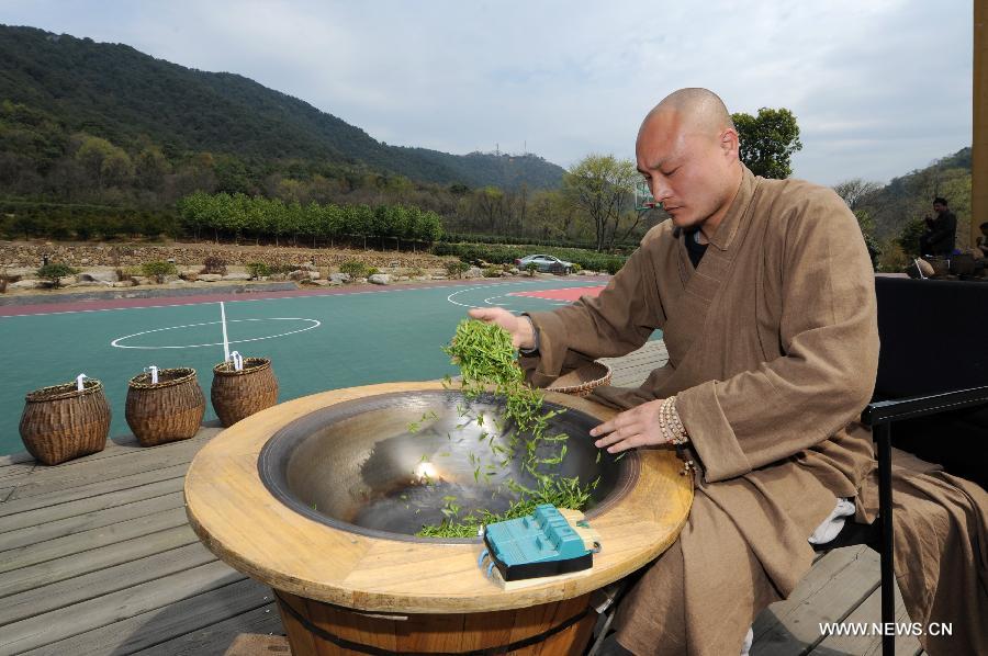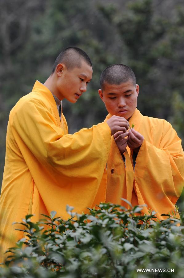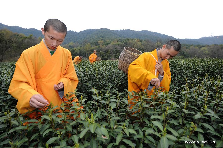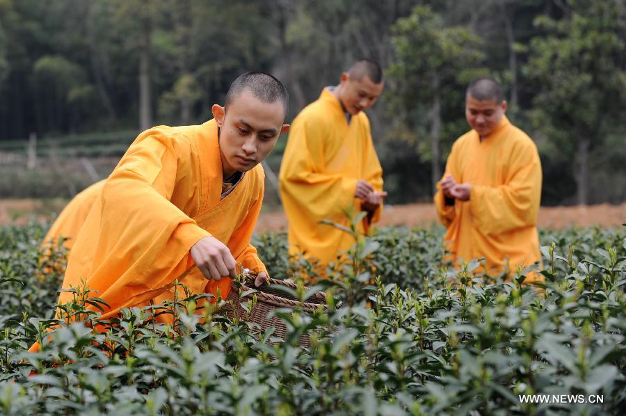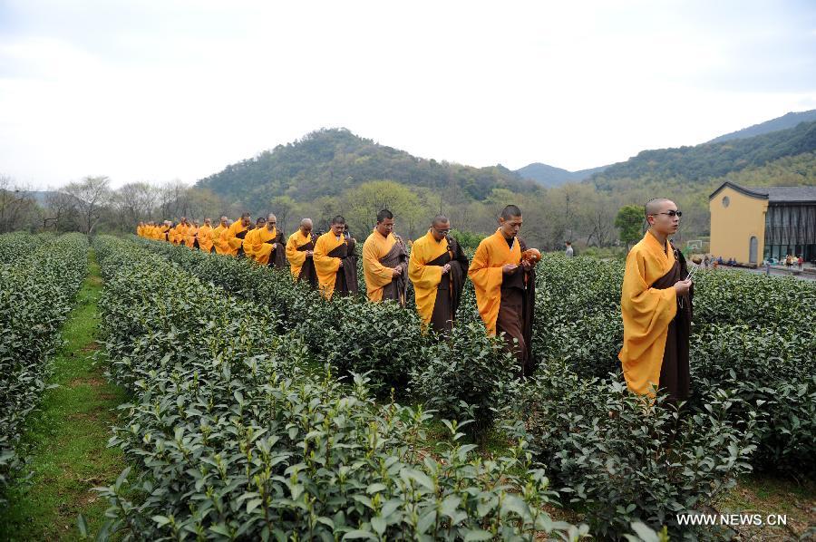 Monks hold a "cleaning" ceremony before picking tea at a tea garden in Fajing Buddha Temple in Hangzhou, capital of east China's Zhejiang Province, March 24, 2014. More than 40 monks in the Fajing Temple began to pick Fajing zen tea belonged to the temple Monday. The Fajing zen tea, produced within the origin area of West Lake Dragon Well(Longjing) Tea, is planted, picked and drinked by monks themselves in the temple. Zen tea is a special tea culture for Buddhists to be enlightened with Buddha dharma through tea making and drinking. (Xinhua/Ju Huanzong)