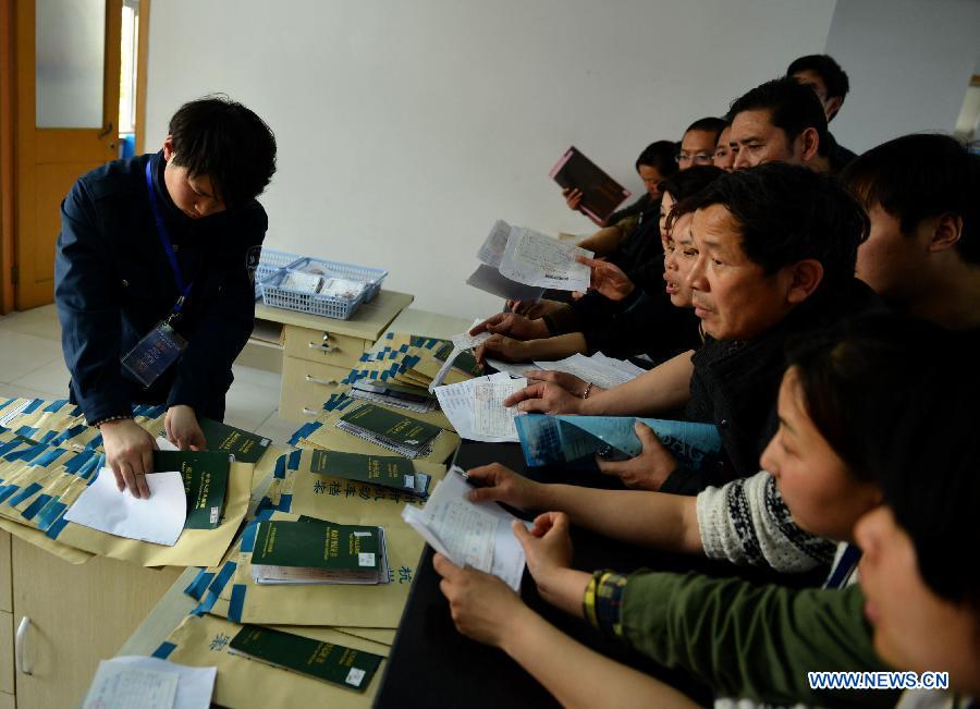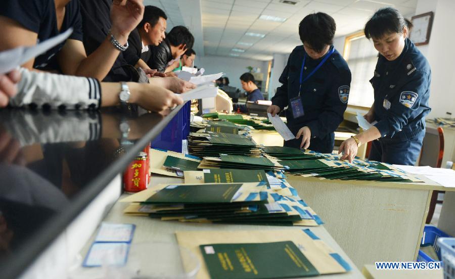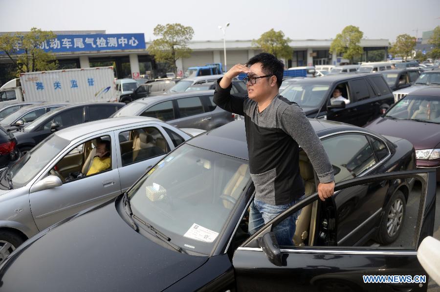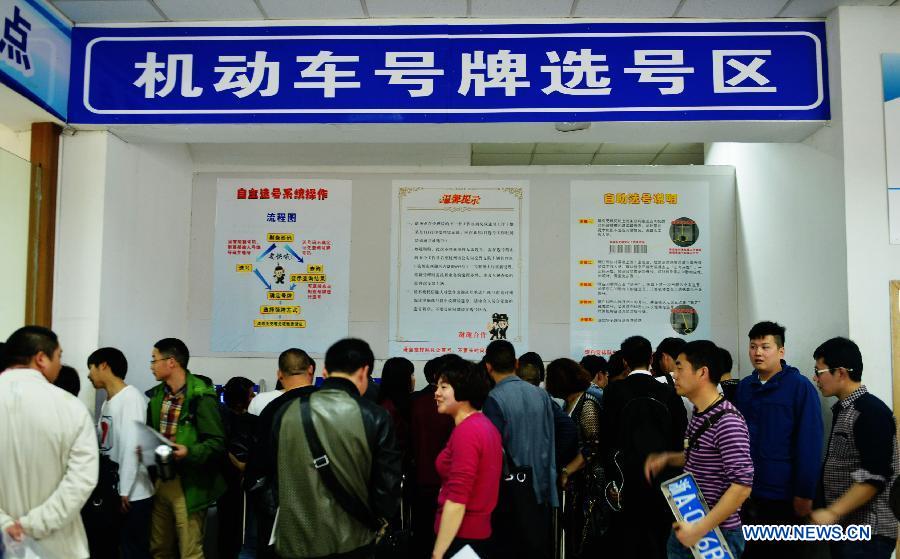 Citizens wait to get car plates in Hangzhou, capital of east China's Zhejiang Province, March 25, 2014. The city announced on Tuesday that it will restrict issuance of new car licenses, making it the sixth Chinese city to clamp down on car ownership in a bid to ease traffic congestion and combat air pollution. The city government will issue new plates via auction and lottery from Wednesday, according to a press conference on Tuesday evening. (Xinhua/Long Wei)