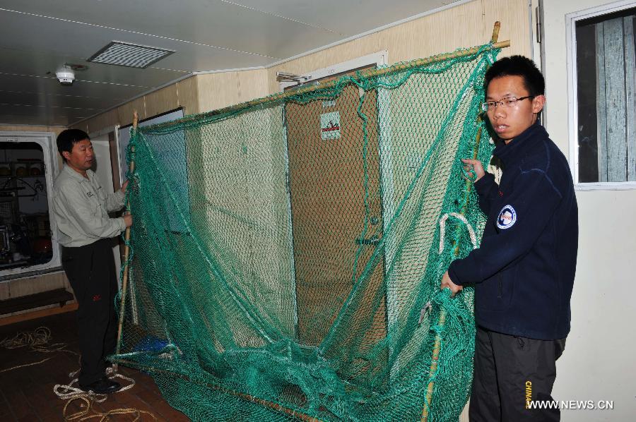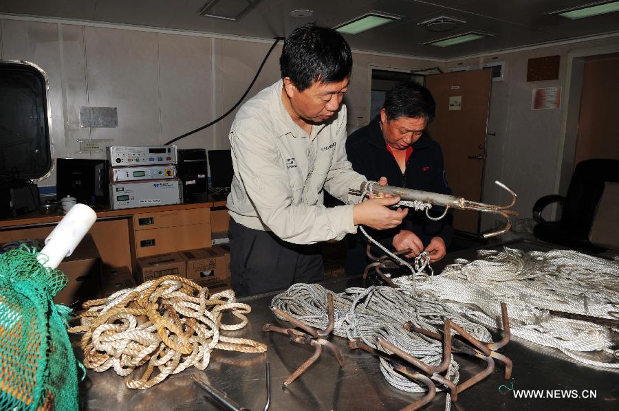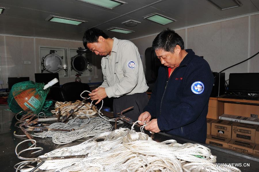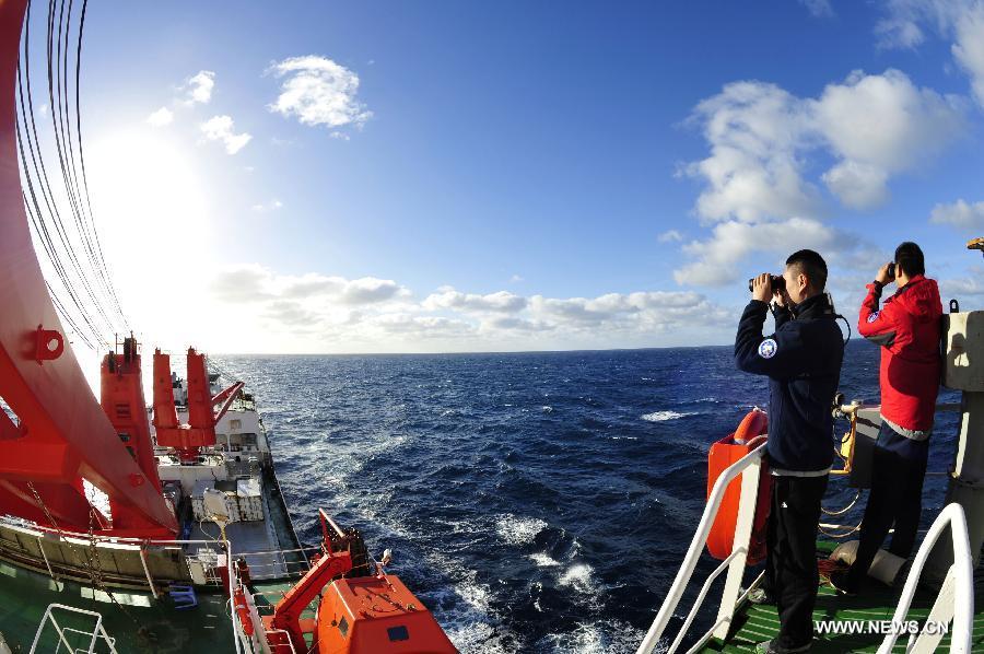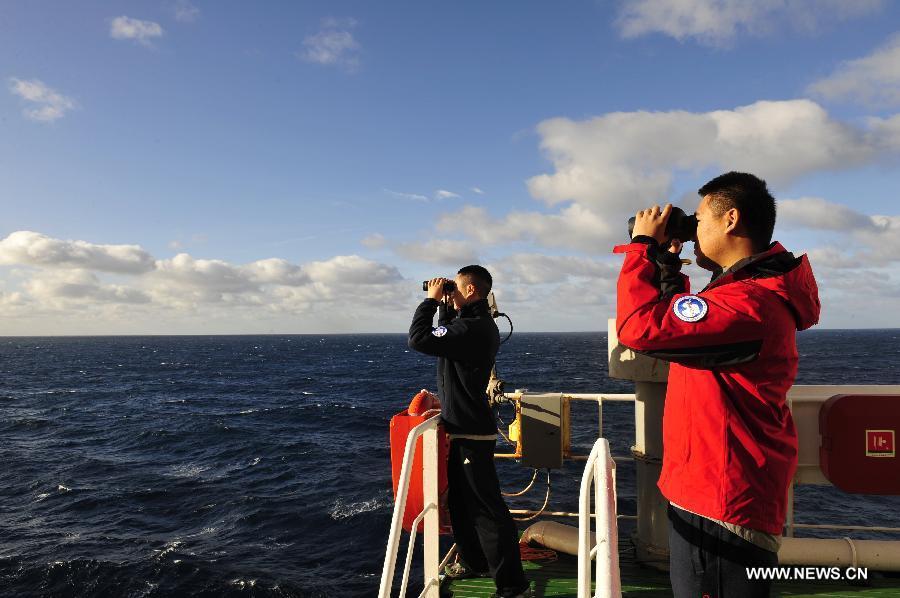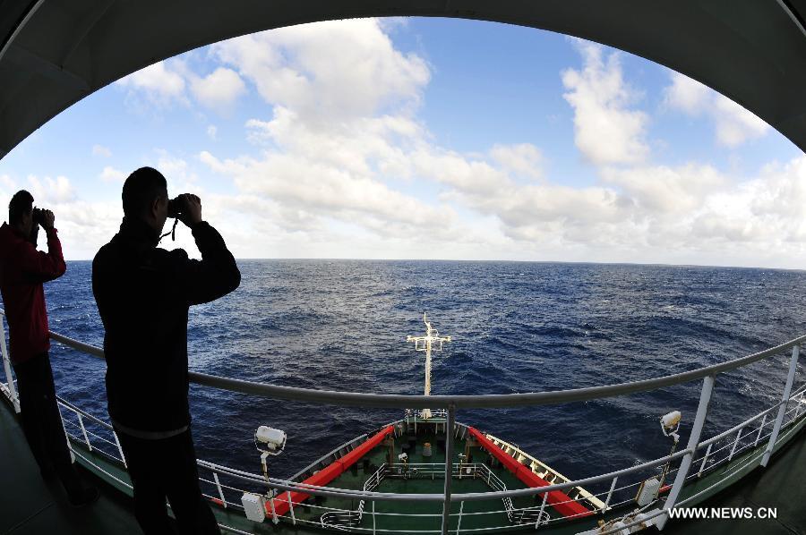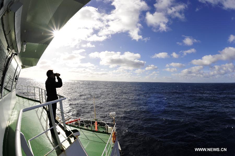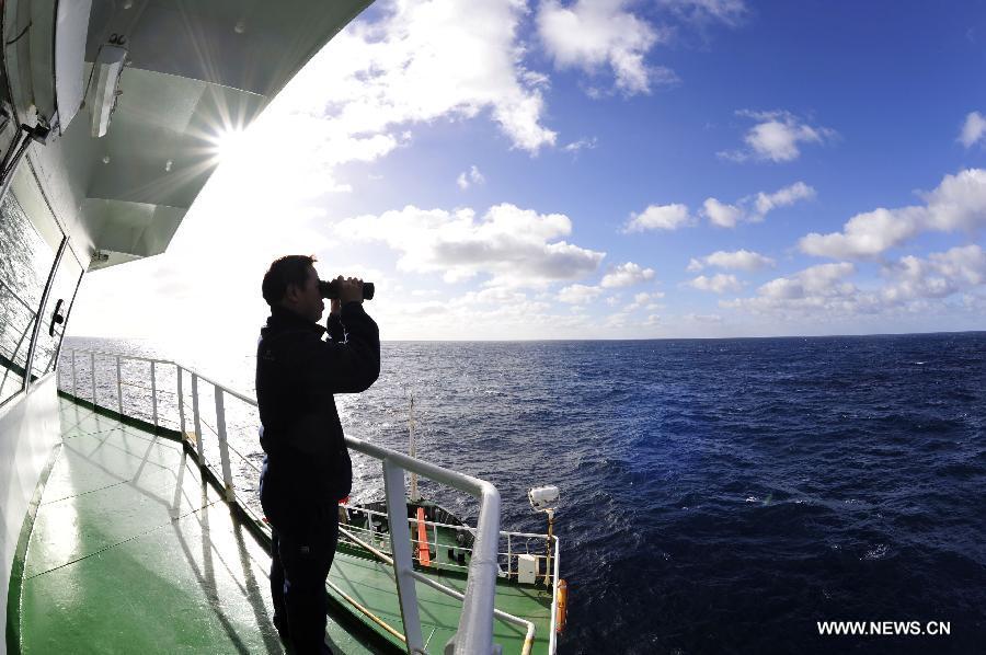 A crew member of Chinese icebreaker Xuelong scans the sea to search for missing Malaysia Airlines Flight MH370 in the area where Chinese airborne searchers spotted some suspicious objects in the southern Indian Ocean on March 26, 2014. (Xinhua/Zhang Jiansong)